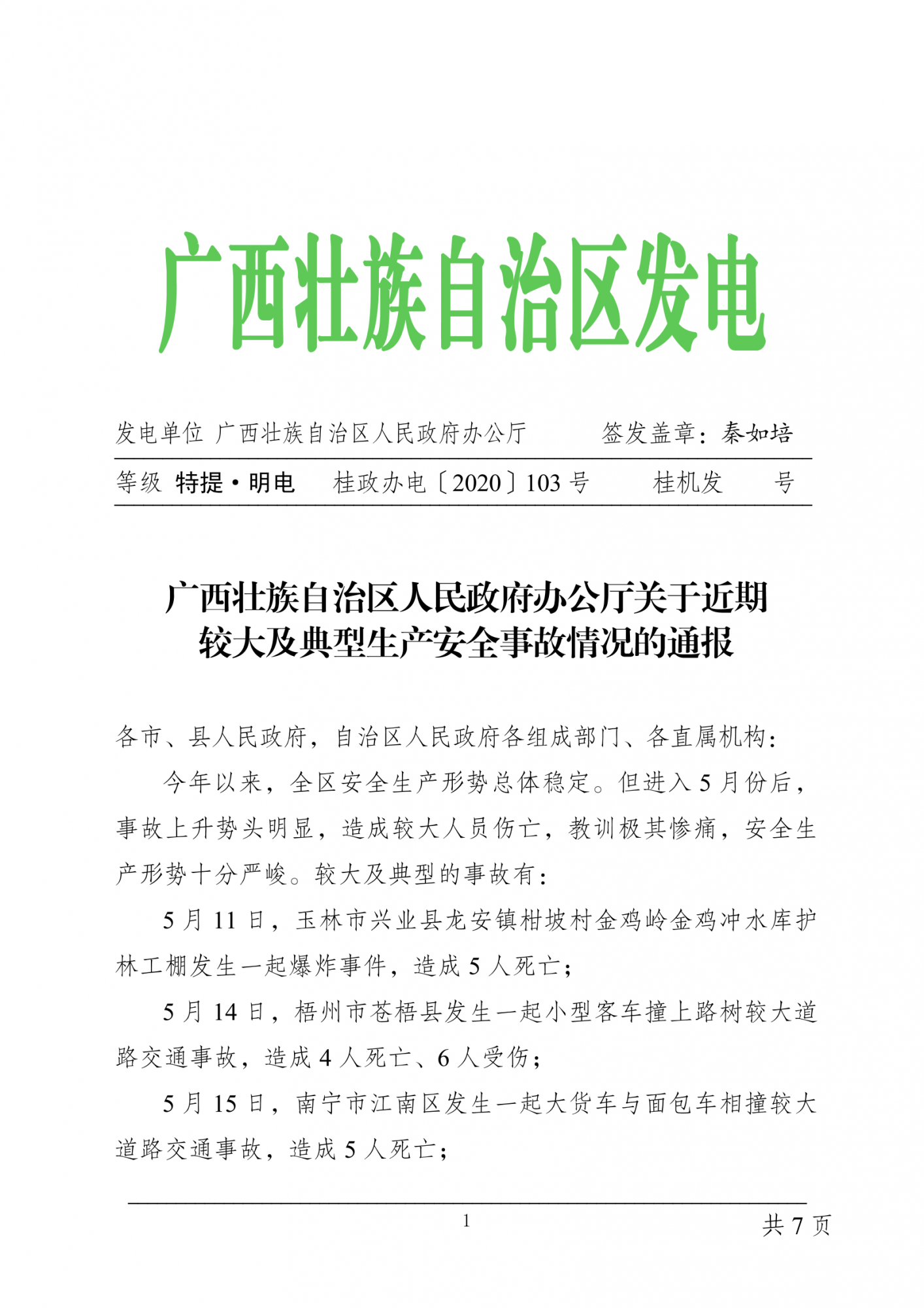 广西壮族自治区人民政府办公厅关于近期较大及典型生产安全事故情况的通报-桂政办电〔2020〕103号