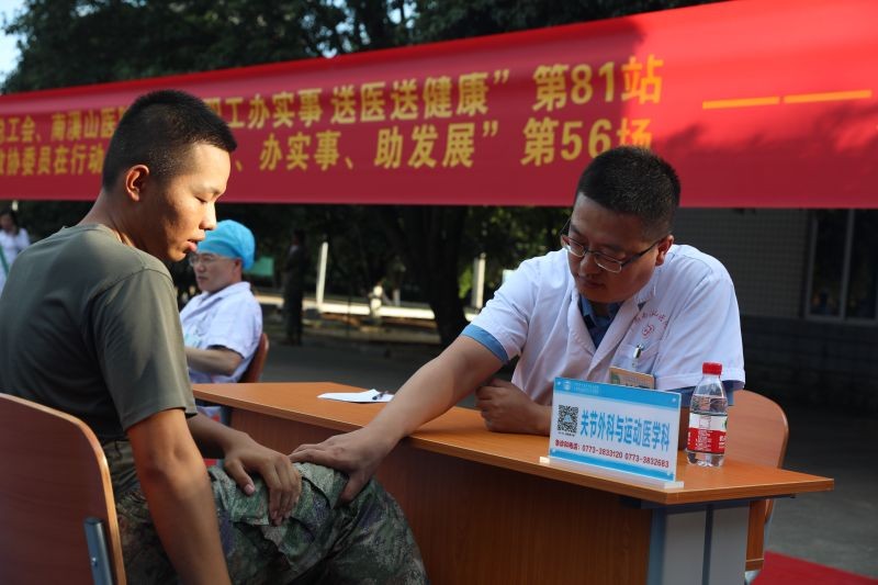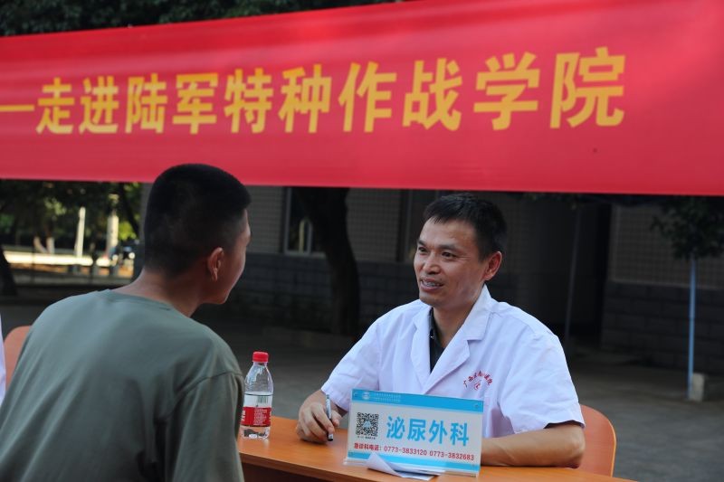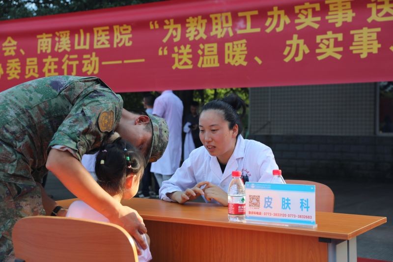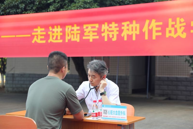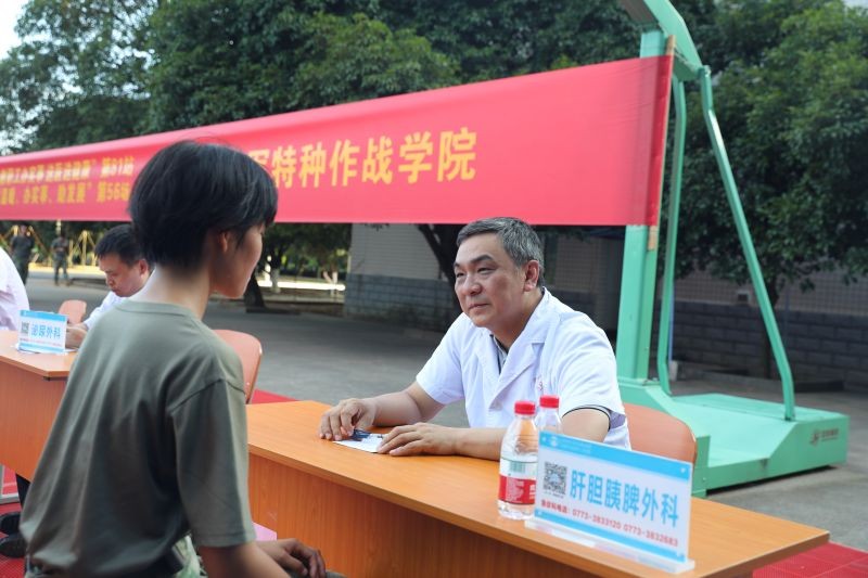 为进一步做好拥军优属、拥政爱民工作,发扬“军民鱼水一家亲”优良传统,在“八·一”建军节即将来临之际,7月12日,广西壮族自治区南溪山医院组织医护专家赴陆军特战学院开展拥军义诊送健康活动。这是桂林市政协、桂林市总工会、广西壮族自治区南溪山医院共同开展的 “为职工办实事 送医送健康进基层”活动的第81场暨桂林市政协委员在行动——“送温暖、办实事、助发展”第56站。