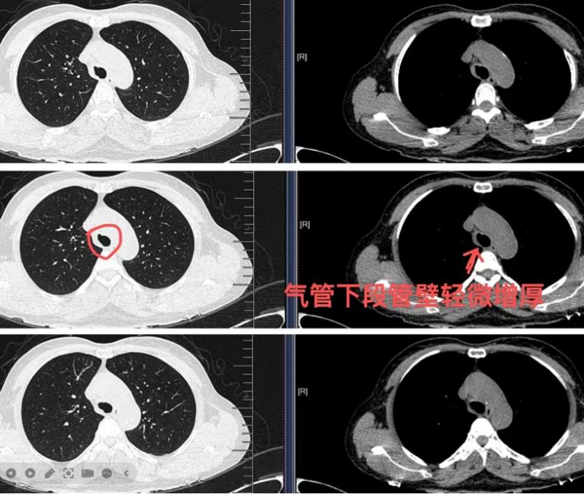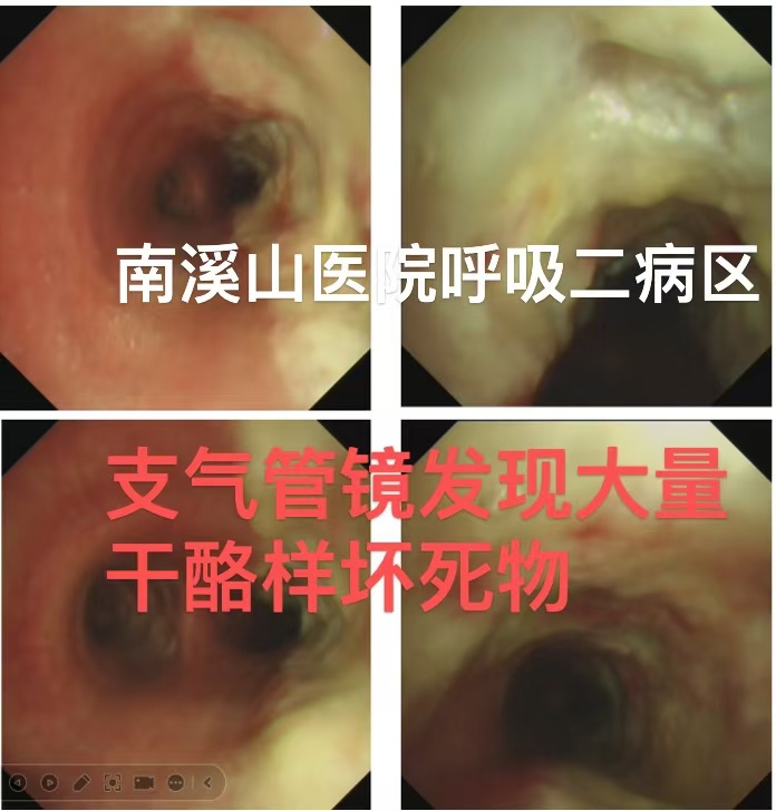 患者秦女士,中年女性,因持续干咳半年余,辗转多家医院就诊,均被诊断为“咳嗽变异性哮喘”,但抗哮喘治疗始终未见明显效果。患者阵发性咳嗽昼夜难眠,给生活和工作带来很大困扰。经朋友介绍至南溪山医院呼吸与危重症医学科二病区(简称呼吸二病区),屈东明博士详细追问病史并重新评估病情,凭借丰富的临床经验,敏锐察觉到病因的复杂性,通过肺部CT检查发现患者气管下段稍隆起,随即建议行电子支气管镜检查。检查中发现气管下段及右主支气管内大量干酪样坏死物,经肺泡灌洗液检测(TB-DNA阳性、抗酸染色阳性+2),最终确诊为“支气管结核”。目前患者已转入结核专科接受规范治疗,病情逐步好转。