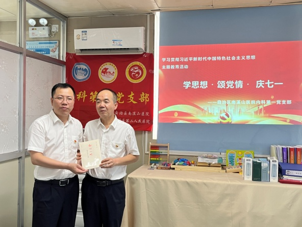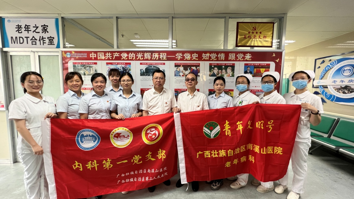 6月29日,广西壮族自治区南溪山医院内科第一党支部的党员医务工作者与病友中的老党员们在病房共同开展“学思想·颂党情·庆七一”庆祝建党102周年主题党日活动。医患党员共同回顾党的奋斗历史,坚定理想初心,以别样的方式共庆佳节到来。