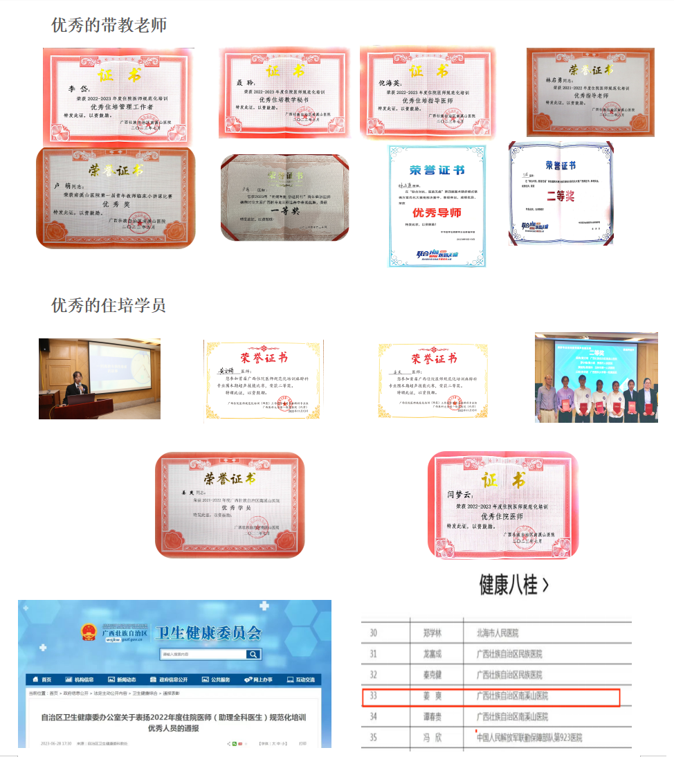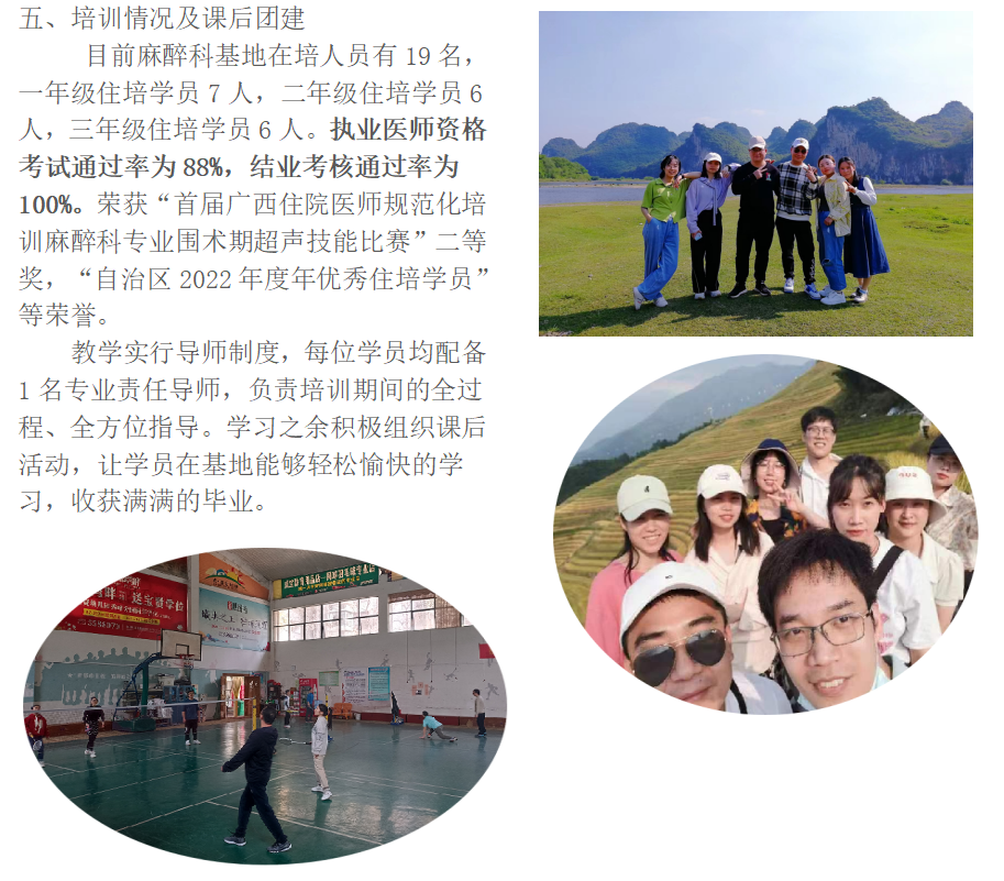 科室现有麻醉医生27人,其中正高职称5人,副高职称7人,中级职称9人,初级职称6人;其中,硕士研究生导师2人,医学博士2人,硕士研究生9人,在读博士1人。其中20余人经过院级及以上师资培训并取得合格证书。大部分指导老师在桂林医学院担任教师,不仅有多样的教学方式,也有丰富的临床经验。目前科室承担广西科技厅和卫健委科研立项十余项,发表SCI及核心期刊论文多篇。