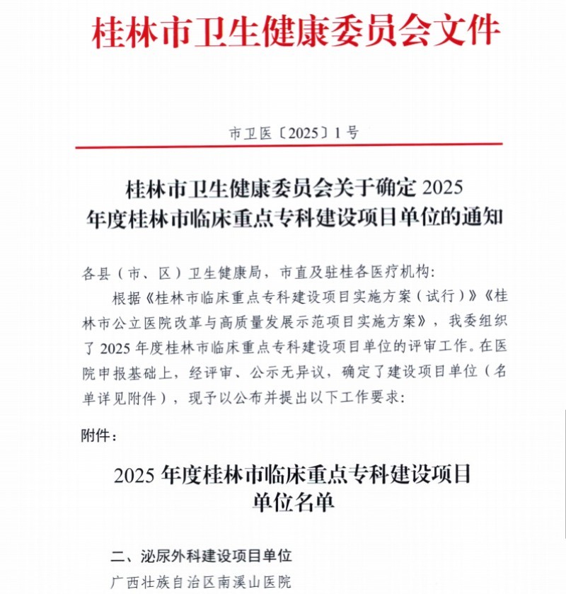 2 月 11 日,桂林市卫生健康委员会公布了2025年度桂林市临床重点专科建设项目单位名单,自治区南溪山医院泌尿外科凭借着卓越的医疗技术、深厚的学科底蕴和出色的团队建设,成功获批桂林市市级临床重点专科建设项目!标志着南溪山医院泌尿外科在桂北地区泌尿外科领域的引领地位迈上新台阶。