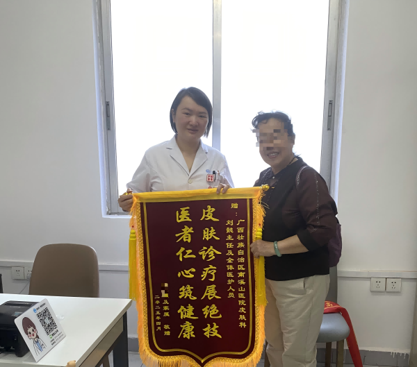 近日,72岁的马女士将一面印有“皮肤诊疗展绝技,医者仁心筑健康”的锦旗送至广西壮族自治区南溪山医院皮肤科性病科主任刘懿手中,感谢医护团队以专业、细致的治疗助其摆脱特应性皮炎的困扰,重获健康生活。