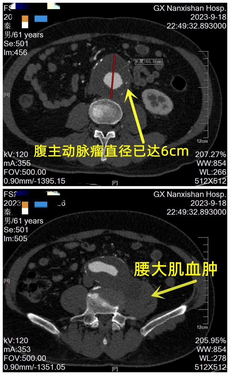“腹主动脉瘤”号称"人体内不定时炸弹"、“沉默的杀手”。近日,61岁的秦先生因为突发腰痛15小时,转院到了广西壮族自治区南溪山医院。医生为秦先生做主动脉CTA 检查后发现他长了腹主动脉瘤并且已经破裂,如果不及时手术随时可能因为大出血而危及生命。
