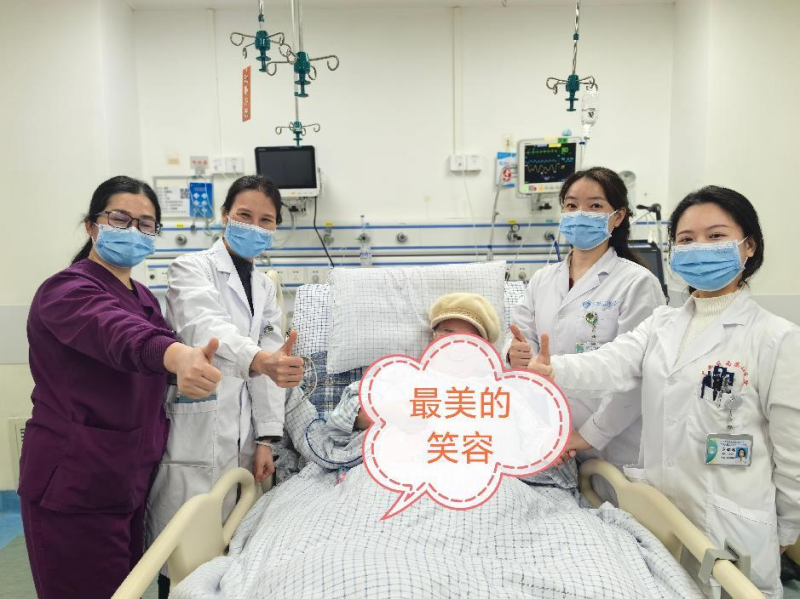 面对如此危重的病情,韦妍飞主任立即与家属商议,决定放手一搏,启动体外膜肺氧合(Extracorporeal Membrane Oxygenation,ECMO)!医生团队开始了“生死赛跑”,赵阿姨于1月17日12:35转入综合重症医学科,同一时间学科ECMO团队启动, 13:17进行ECMO置管术,13:40穿刺成功,13:45ECMO转机成功……张阿姨血氧饱和度从最低的60% 逐渐上升至99%,转危为安,ECMO团队成员在这场生死赛跑中赢得先机,为张阿姨争取了生机。