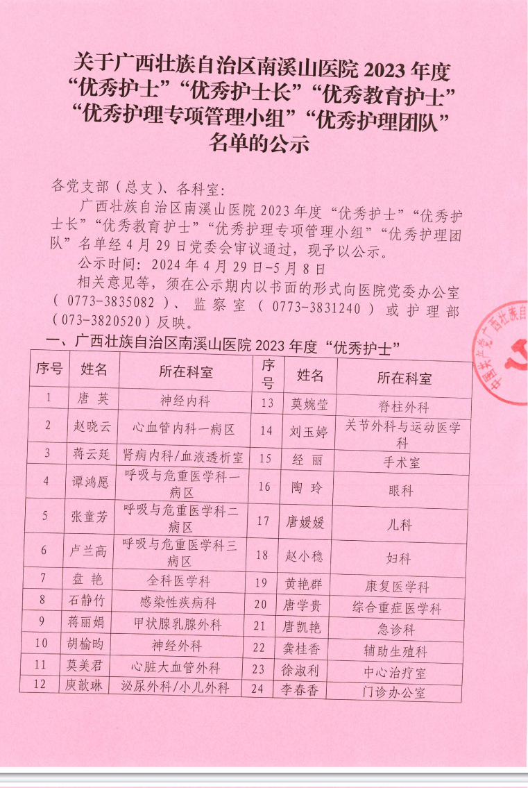 关于广西壮族自治区南溪山医院2023年度“优秀护士”“优秀护士长”“优秀教育护士”“优秀护理专项管理小组”“优秀护理团队”名单的公示
