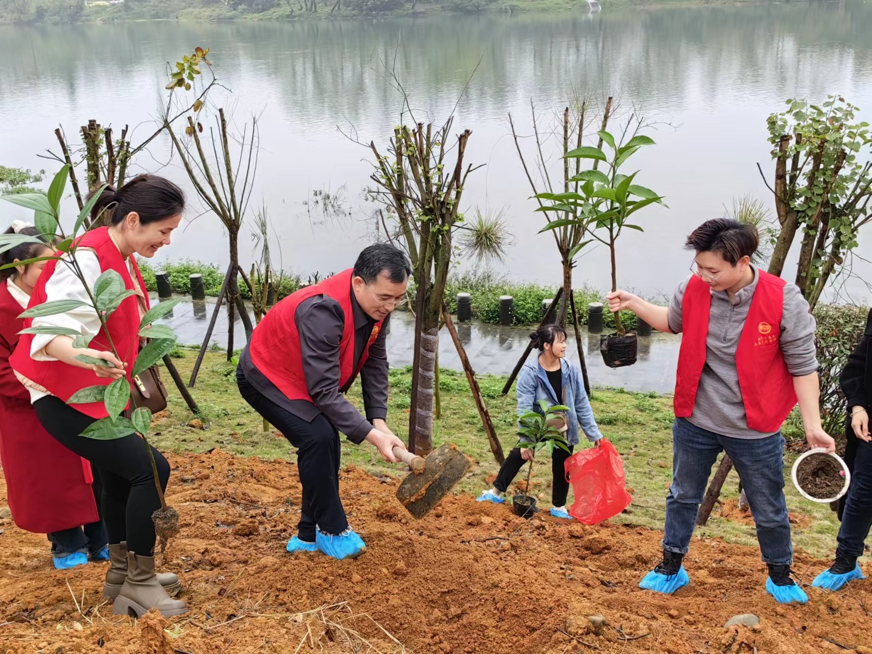 活动当天,支部书记带领党员及积极分子在母亲河--漓江周围开展植树活动。大家分为三人一组,挥锄挖坑,扶树正苗,把挑选好的小树苗,在漓江边种下,并浇水定位。每个环节衔接有序,干劲十足。经历了2个多小时的辛勤劳作,一株株树苗错落有致,迎风挺立,焕发出无限生机与活力。