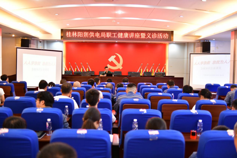 活动伊始,急诊科何跃副主任医师以《人人学急救,急救为人人》为主题,为桂林阳朔供电局的职工们开展了一场内容丰富、实用性强的急救知识讲座。他通过实际案例的分享,让复杂的急救知识变得通俗易懂,深入浅出地传授了急救的基本知识和操作技能,让在场的每一位职工都受益匪浅,不仅提升了他们的户外急救意识,还让他们掌握了在紧急情况下自救互救的关键技能。