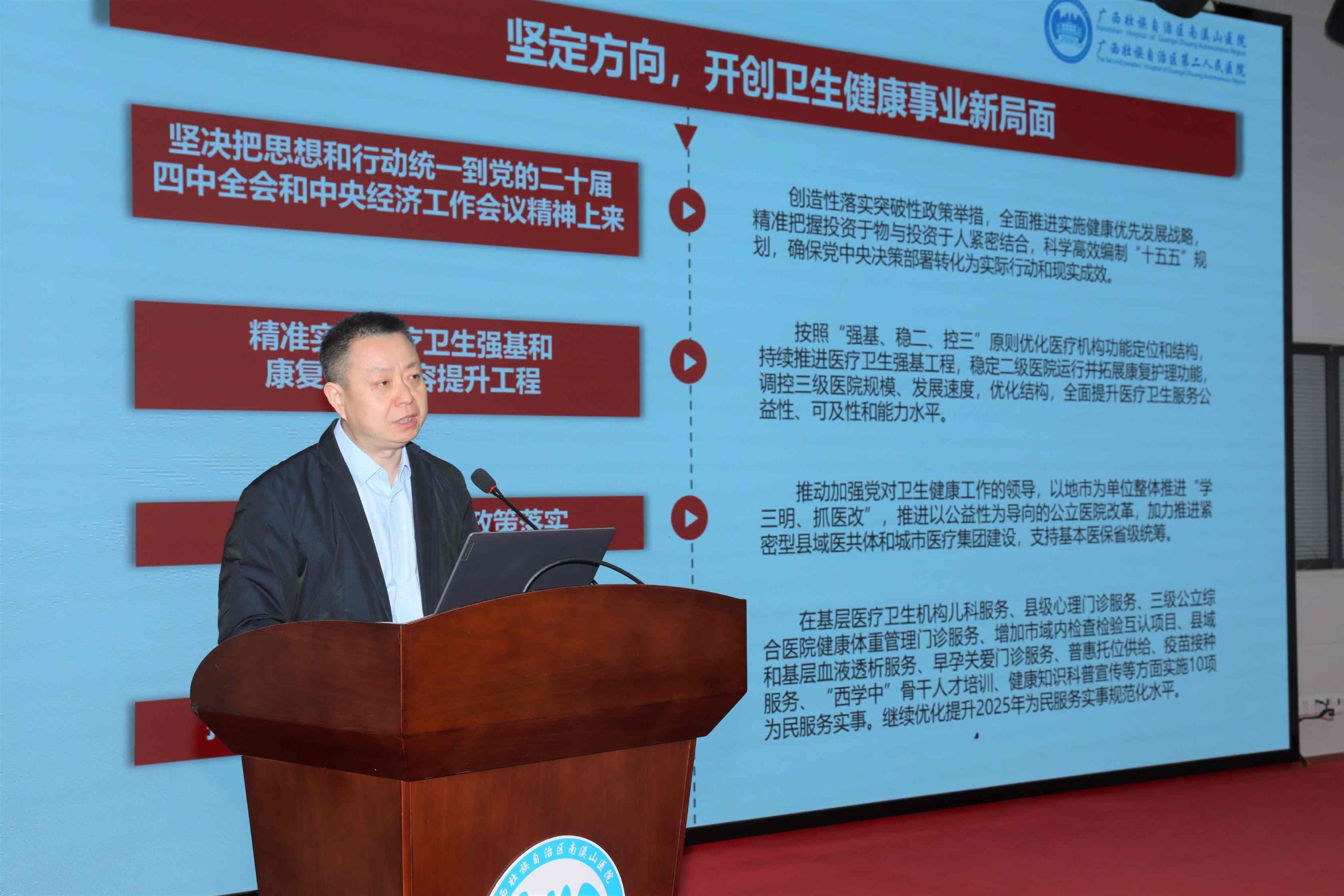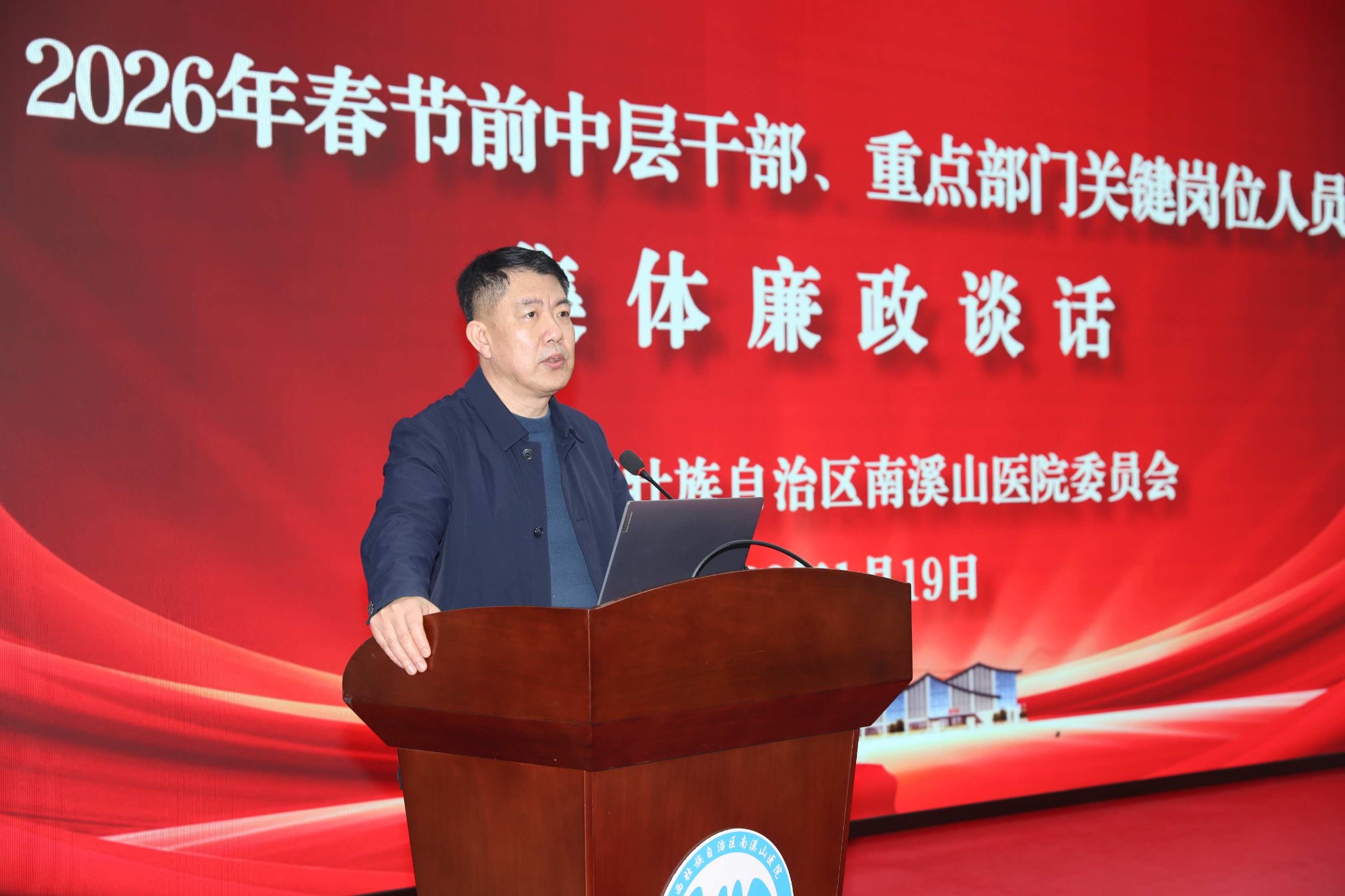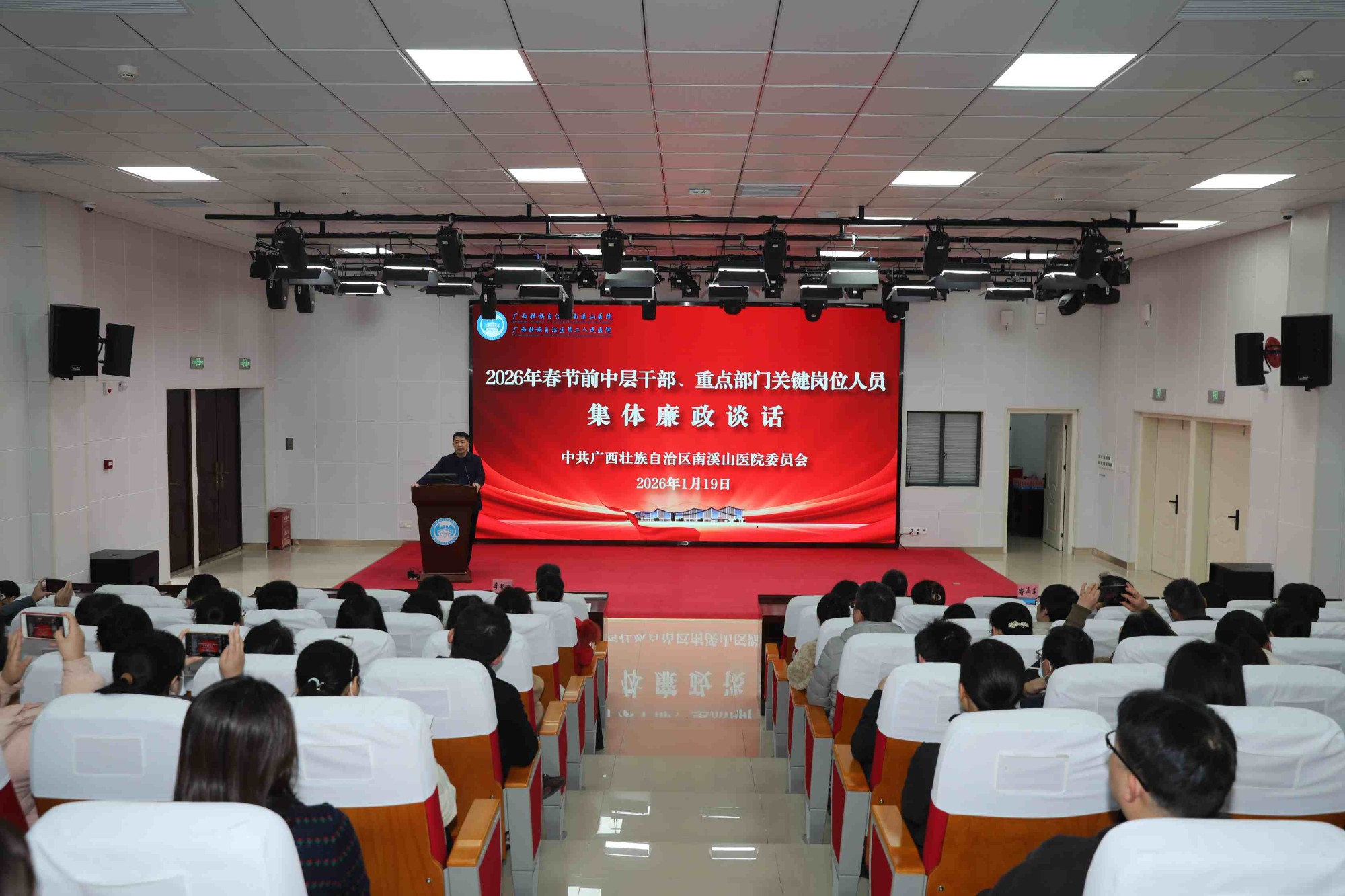 为切实筑牢节日廉洁防线,压实全面从严治党主体责任,1月19日下午,广西壮族自治区南溪山医院党委、纪委联合召开2026年春节前中层干部及重点部门关键岗位人员集体廉政谈话会。会议以“开年第一讲”的形式为节日期间廉洁自律工作敲响“前置警钟”,为医院高质量大跨步发展注入强劲“廉动力”。医院党委书记柳宏林,党委副书记、院长李朝旭,纪委书记喻泽军出席会议并讲话,全体中层干部、重点部门关键岗位人员参加会议。