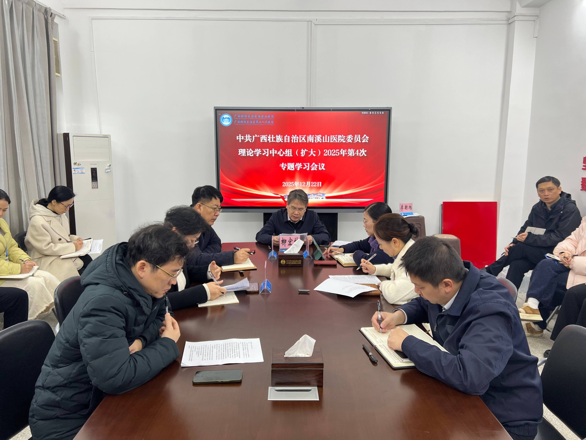 12月22日,自治区南溪山医院党委理论学习中心组举行2025年第4次专题学习,深入学习贯彻二十届四中全会精神,《习近平谈治国理政》第五卷,《习近平法治思想学习纲要(2025年版)》,《习近平关于健康中国论述摘编》,中央经济工作会议精神。医院党委书记柳宏林主持会议并讲话。