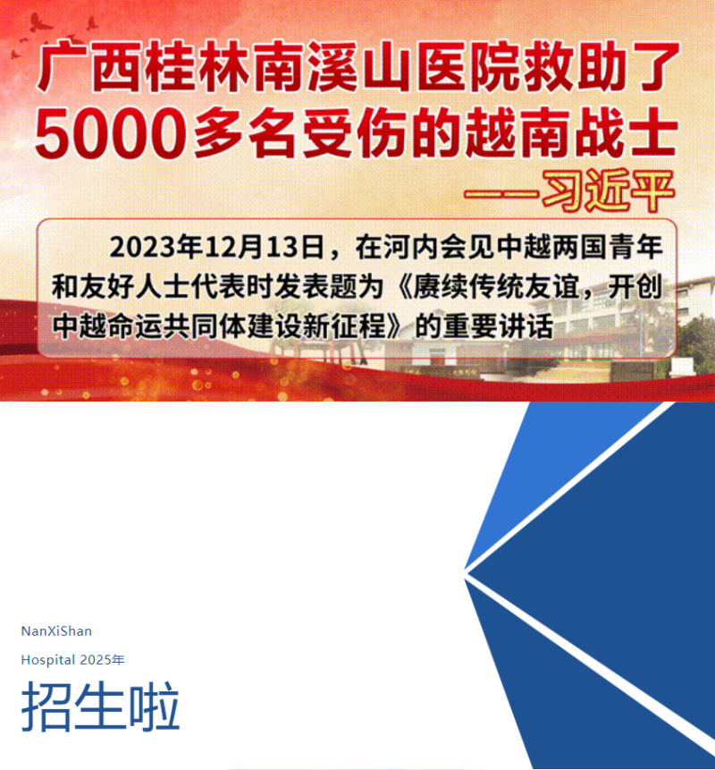 2023年12月13日,中共中央总书记、国家主席习近平在河内同越共中央总书记阮富仲共同会见中越两国青年和友好人士代表,并发表了题为《赓续传统友谊,开创中越命运共同体建设新征程》的重要讲话,其中提到“广西桂林南溪山医院救助了5000多名受伤的越南战士”。
