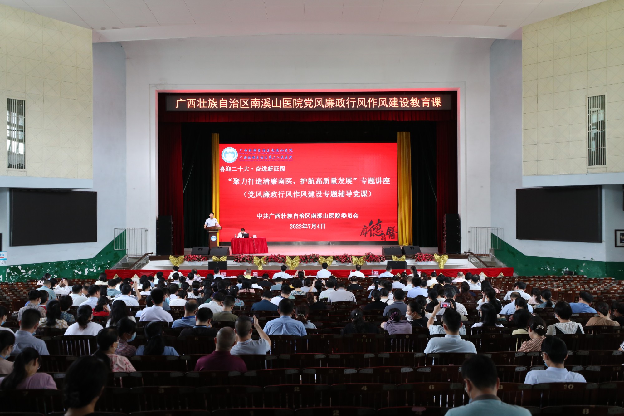 为聚力打造清廉南医,护航医院高质量发展,7月4日,广西壮族自治区南溪山医院邀请桂林市纪委监委第八监督检查室主任张文波进行党风廉政行风作风建设专题授课,警钟长鸣筑牢思想防线。医院党政班子成员、中层干部、重点部门关键岗位人员以及各党支部书记、纪律委员等300余人参加讲座。