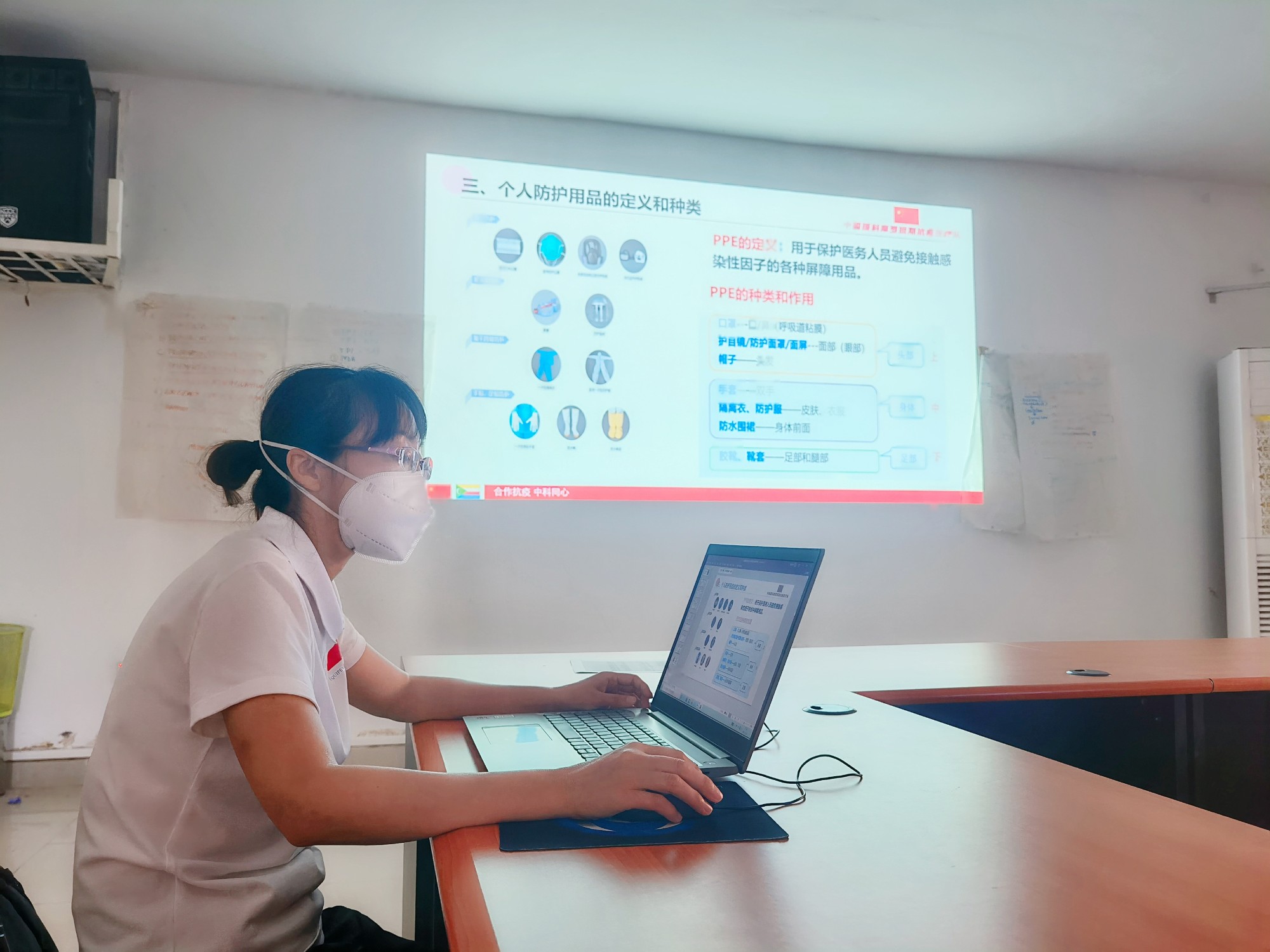 来自广西壮族自治区南溪山医院的副主任护师蒋乾坤通过现场PPT课件授课与视频演示教学相结合的方式,对科方实验室检测人员进行了防护用品的选择和使用的培训,培训主要针对他们在调研中发现的医务人员个人防护存在的潜在风险。蒋乾坤围绕标准预防详细讲解了防护用品的种类和作用、防护用品的选择原则、穿脱方法、穿脱流程及使用过程中的注意事项,并现场播放英文版《防护服穿脱流程》视频,向实验室检测人员直观展示了穿脱防护用品的每个细节。她在培训中积极向科方医务人员倡导重视防护用品使用的同时还应重视医务人员自我的防控意识和行为隔离,根据预期可能发生的暴露风险和实际操作可行性,科学的使用防护用品,使其在抗疫工作中能够发挥应有的作用,确保医患安全。