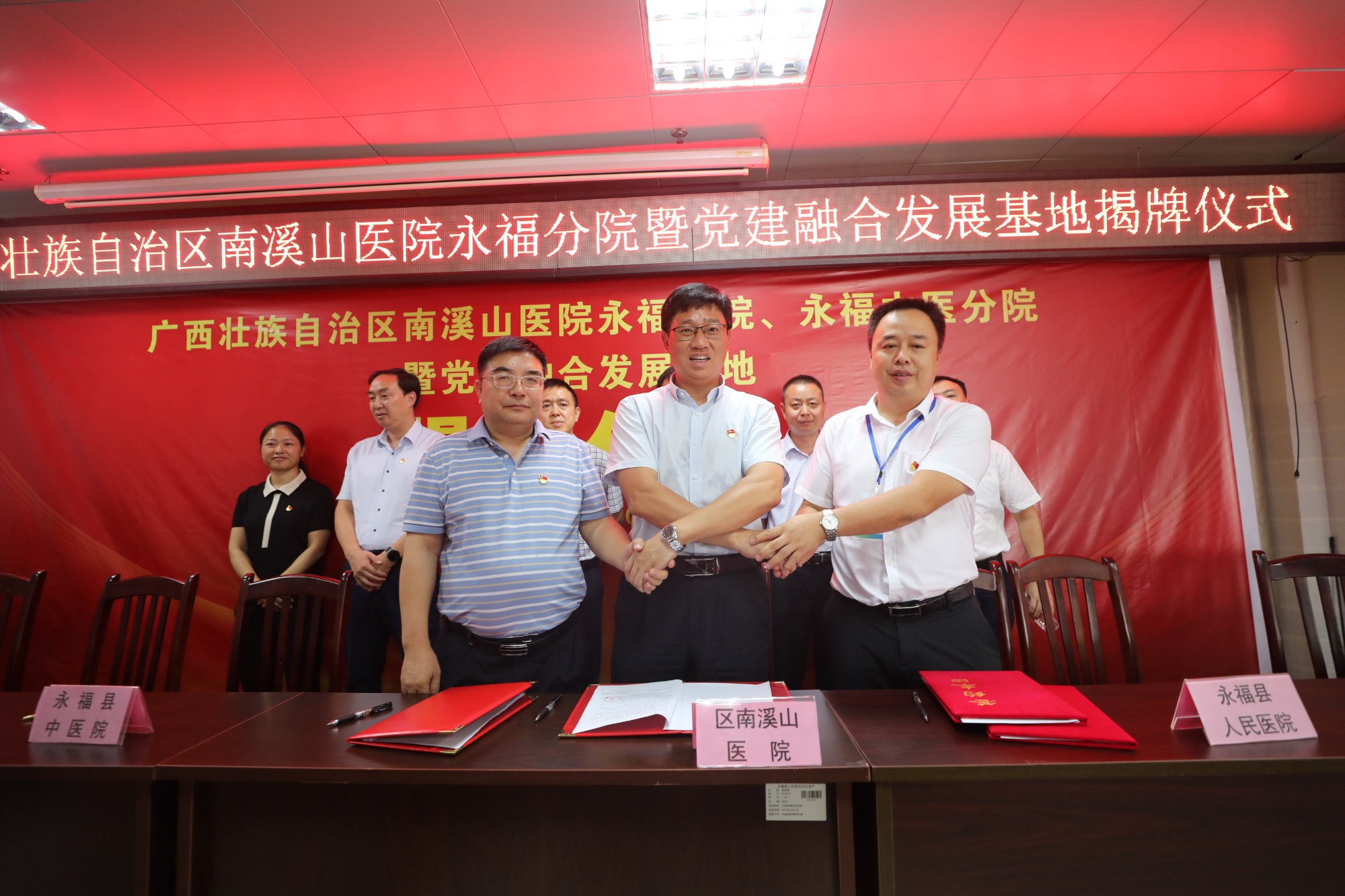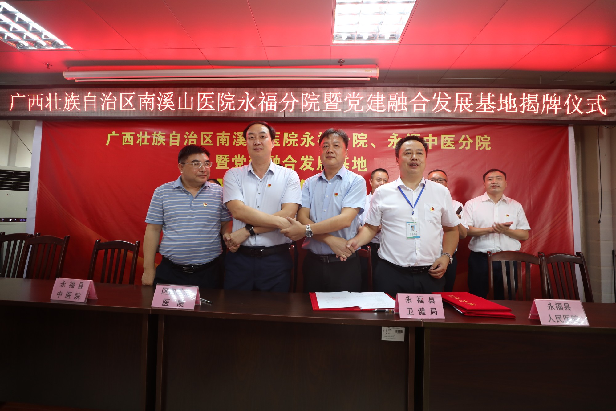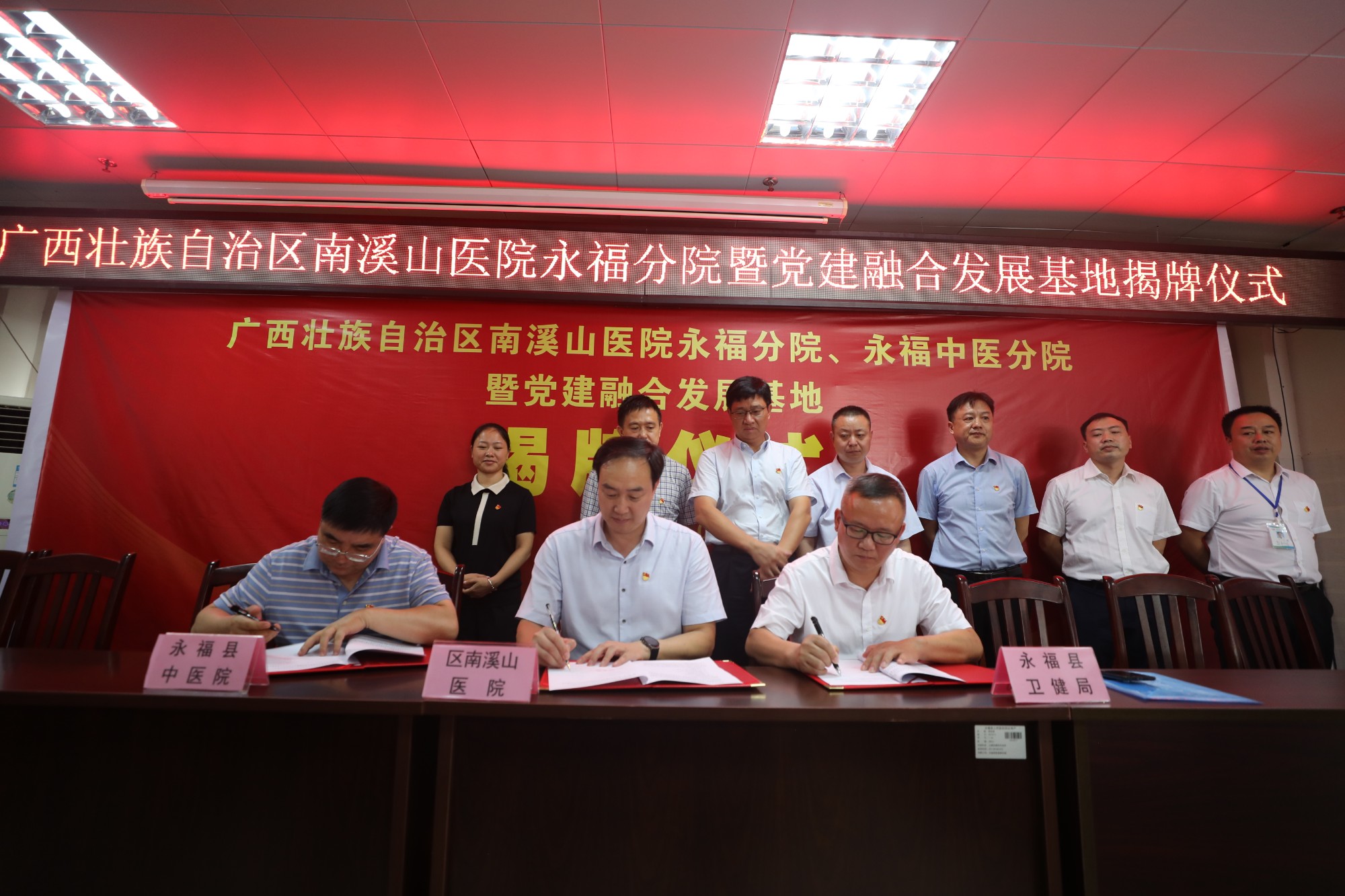 仪式上,广西壮族自治区南溪山医院党委书记戴前富,党委副书记、院长刘宇军、永福县卫健局局长以榕平、永福县人民医院院长黄卫能、永福县中医院党总支书记蒋庭谦分别代表自治区南溪山医院、永福县卫生健康局、永福县人民医院、永福县中医医院签署合作协议书,正式成立自治区南溪山医院永福分院和永福中医分院以及党建融合发展基地。