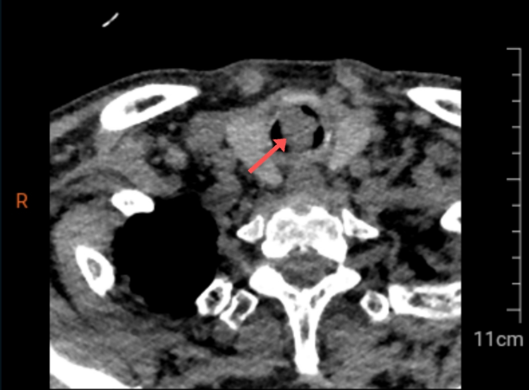 刚入院时,高大爷虚弱地蜷缩在床上,一动也不敢动,喉咙随着呼吸发出阵阵响声,就像冬天里的大风吹过狭窄的门缝发出“呼呼”的声音。在给他进行急诊CT检查时,医生和护士推着床,备着喉镜、抢救包,小心翼翼地,生怕高大爷一口气上不来,随时可能出现生命危险。