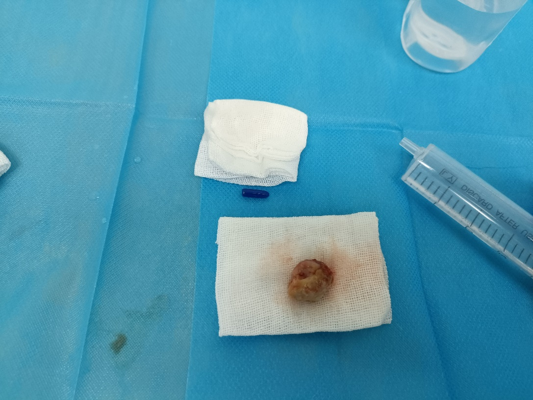 医生通过胸部CT图像发现,在高大爷的气管内距离声门下约1.5公分处有一个肿物,几乎完全堵塞了气道。找到了呼吸困难的原因,医生认为必须进行紧急手术解除梗阻,否则高大爷随时有可能猝死。因此,呼吸与危重症医学科二病区介入团队迅速完成术前准备,在麻醉科的协助下为高大爷完成了全麻下硬质气管镜下肿瘤切除术+APC+冷冻术,一颗大小约1.5*2.0cm的肿物从高大爷的气管内被分离出来。从进镜到铲切肿瘤,仅用时短短20分钟,手术过程非常顺利。