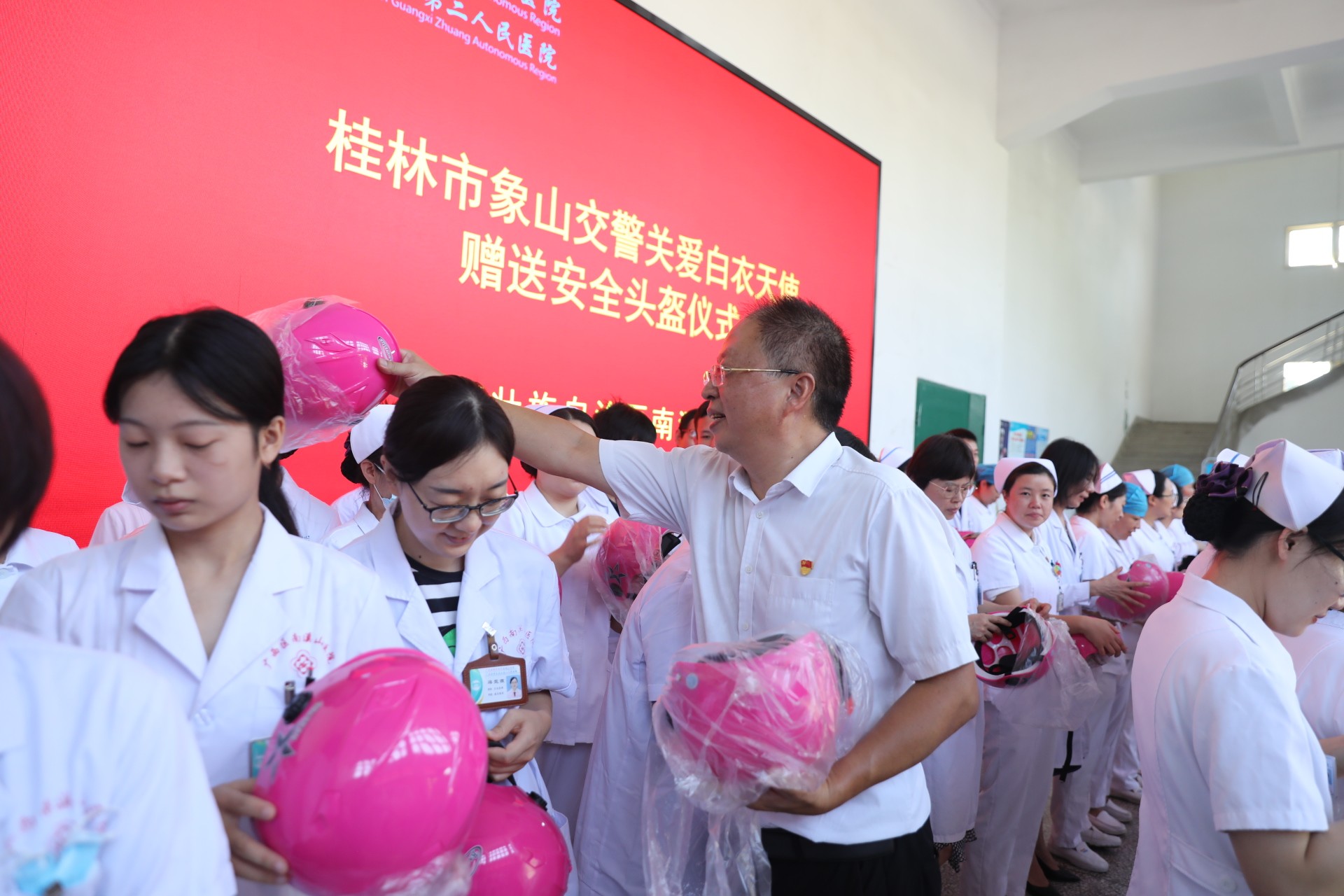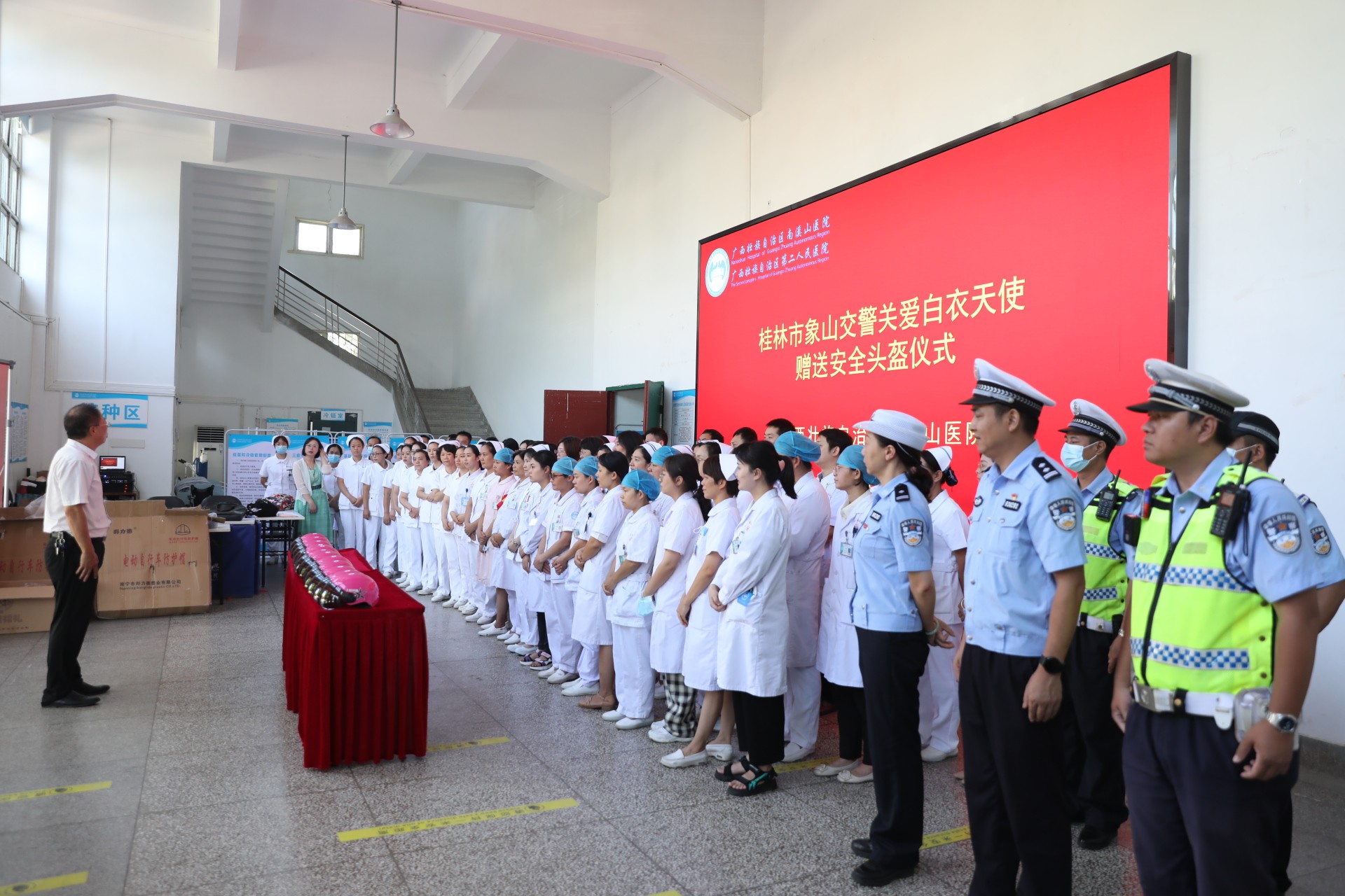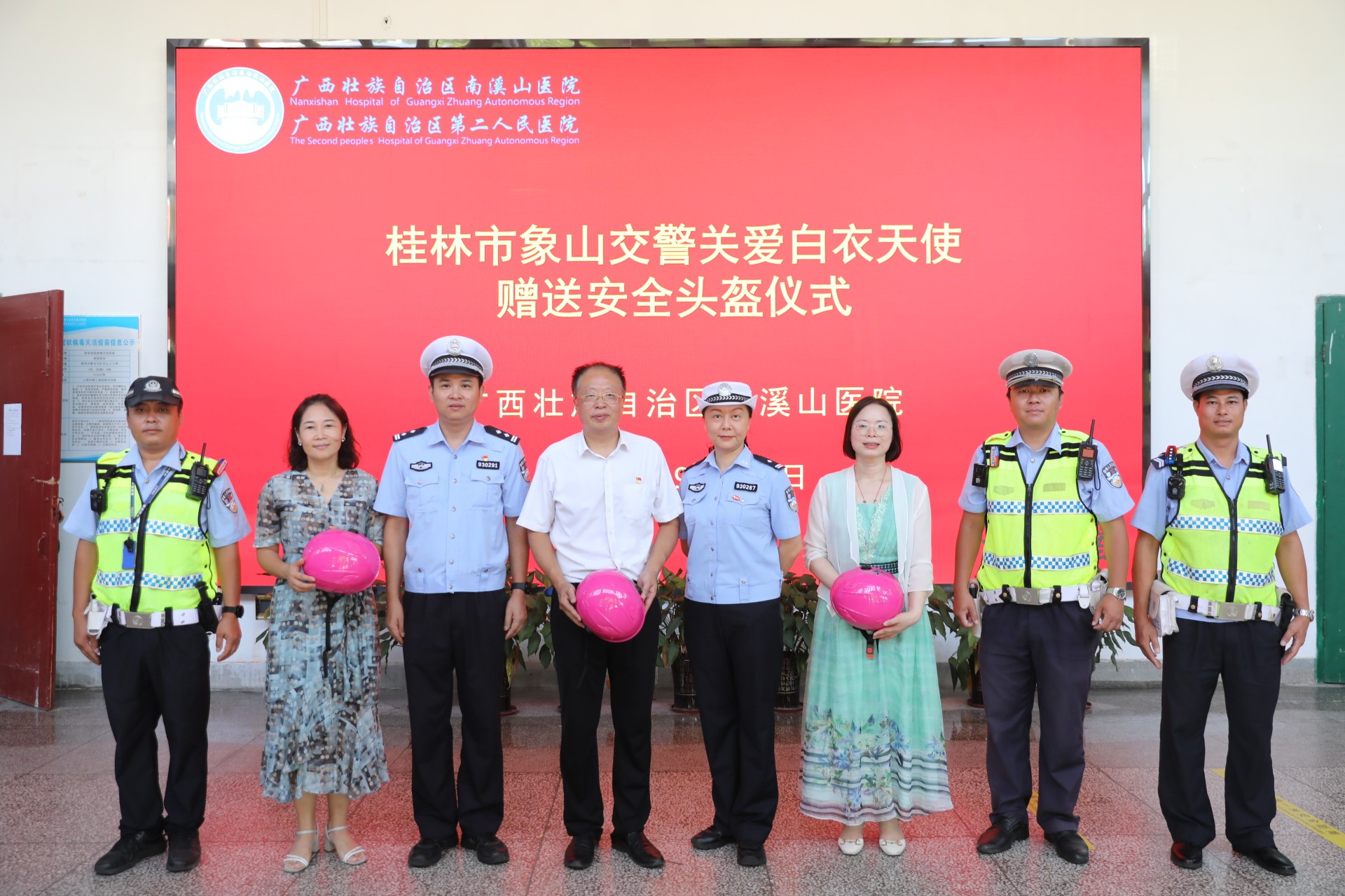 为向奋战在疫情防控和救死扶伤、治病救人工作一线的“白衣天使”致敬,普及新的交通法规,助力桂林市创建全国文明城工作常态化开展。9月26日上午,应南溪山医院工会邀请,桂林市象山交警大队一行5人在石全有副大队长的带领下走进南溪山医院,开展“关爱白衣天使赠送安全头盔”活动。当天共有来自南溪山医院各分工会的100名职工收到了象山区交警赠送的电动车安全头盔。