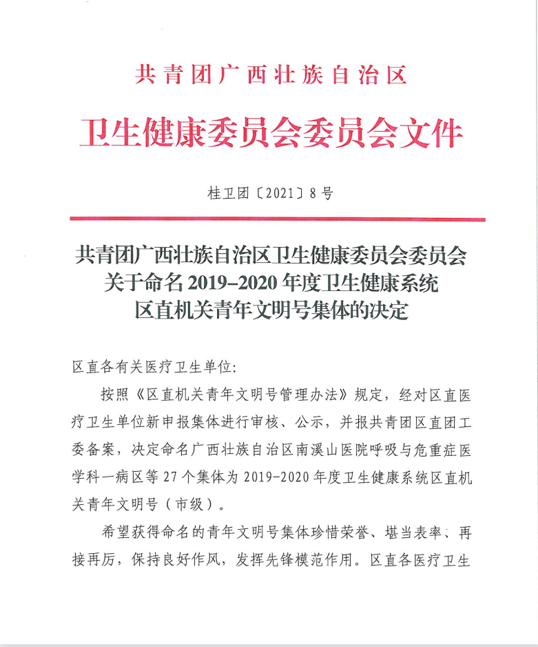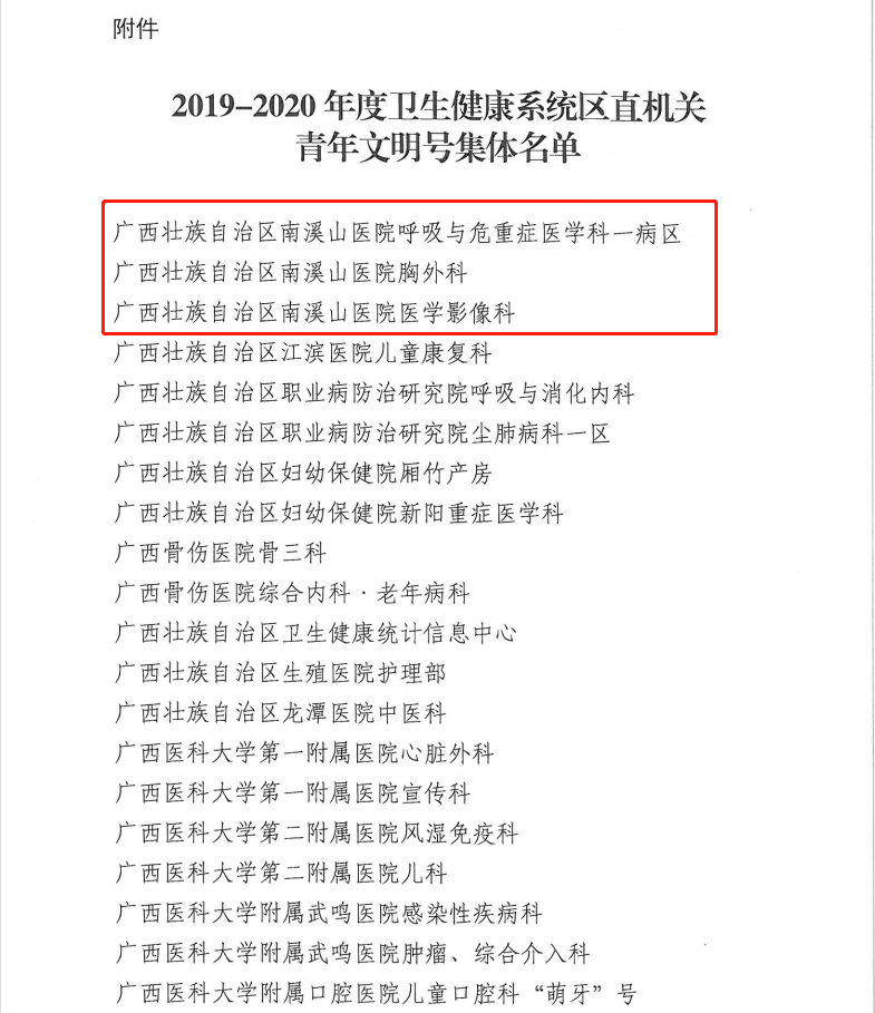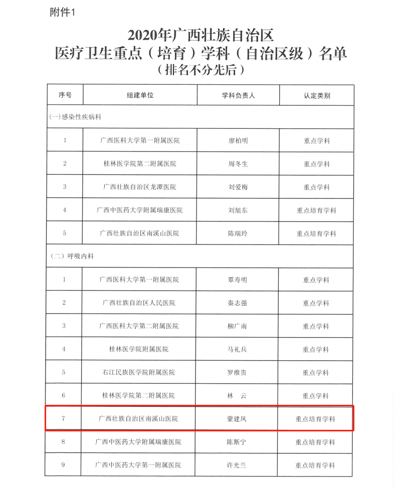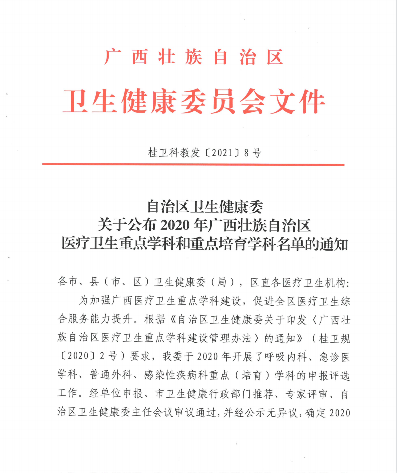 日前,自治区卫生健康委公布了2020年广西壮族自治区医疗卫生重点学科和重点培育学科名单,广西壮族自治区南溪山医院呼吸与危重症医学科被确定为2020年广西医疗卫生重点培育学科。