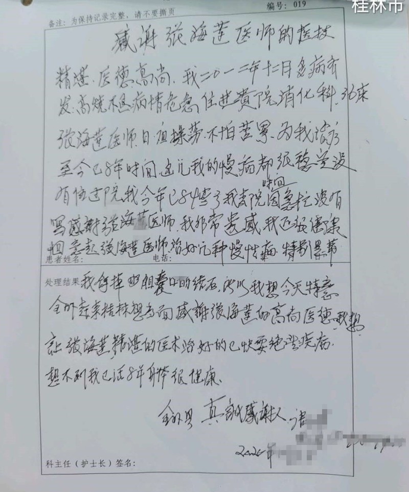 据唐大爷回忆,8年间他的病情一直很稳定,也没有再因此住过院,自己觉得最大的遗憾就是当年太匆忙,之后也因为各种原因,没能好好的感谢当年救治她的张医生如今虽然年事已高,但还是要坚持写下这一封感谢信,表达对张海莲医生真诚的感激之情。