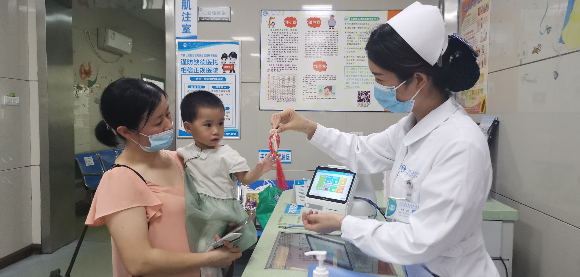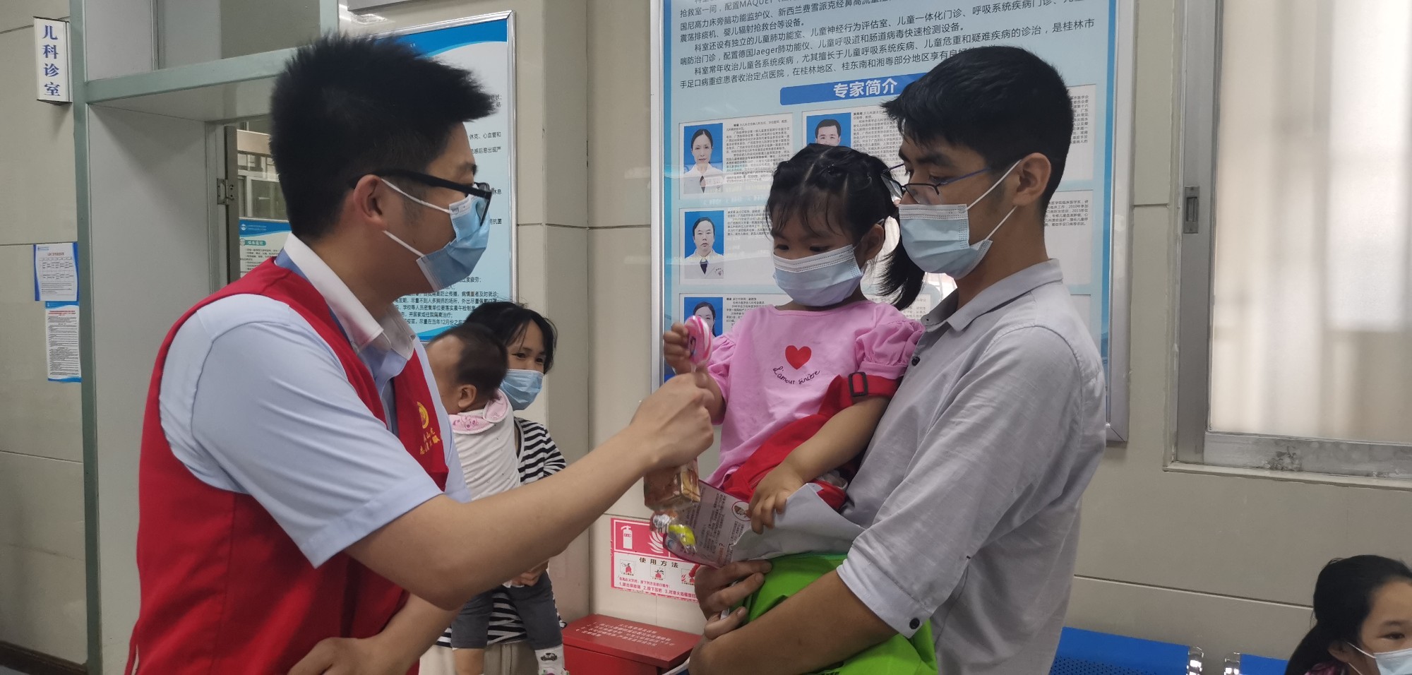 6月1日,南溪山医院儿科门诊分诊护士向小朋友赠送驱蚊香囊。