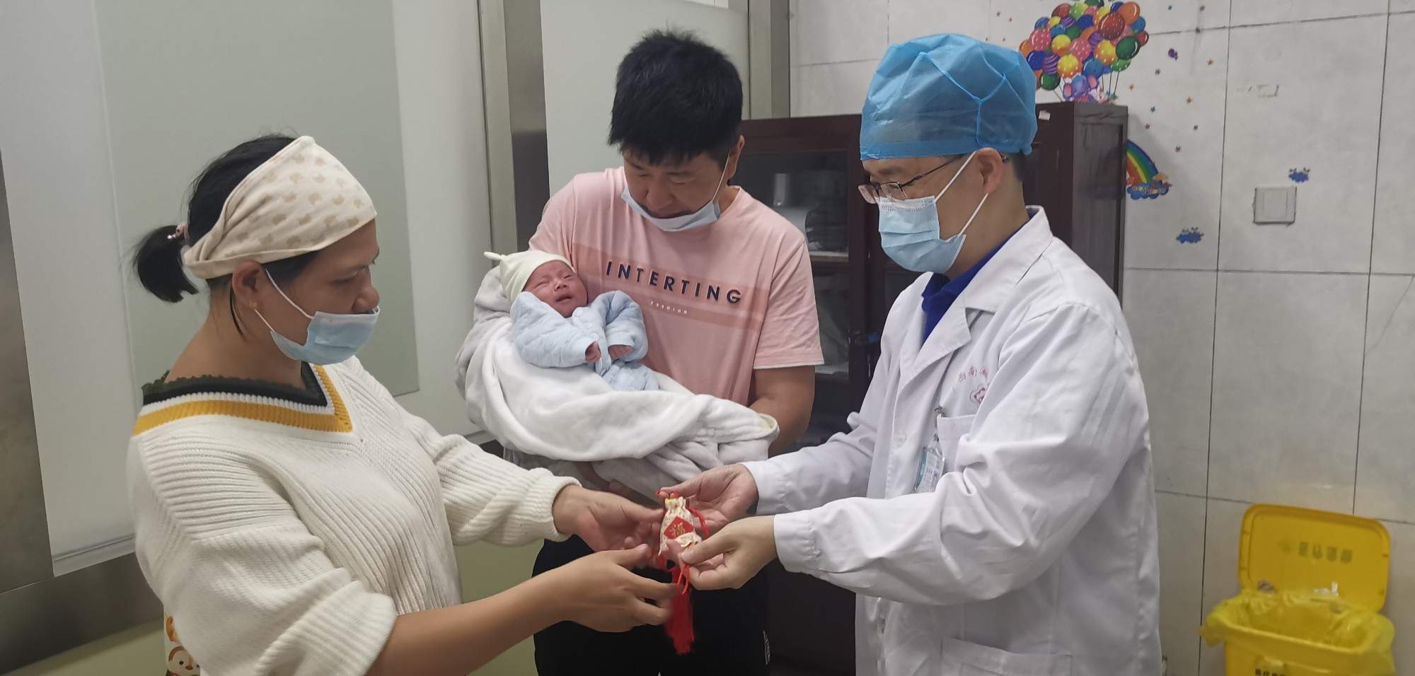 6月1日,南溪山医院新生儿科主任莫炜明向孩子家长赠送驱蚊香囊,祝孩子健康成长。张超群 摄