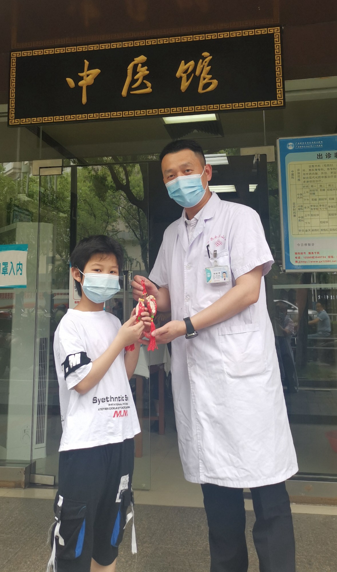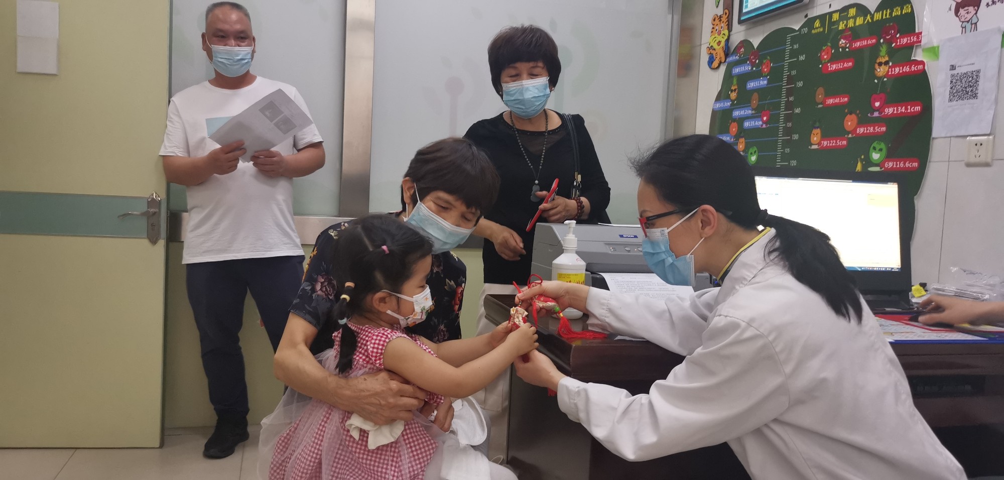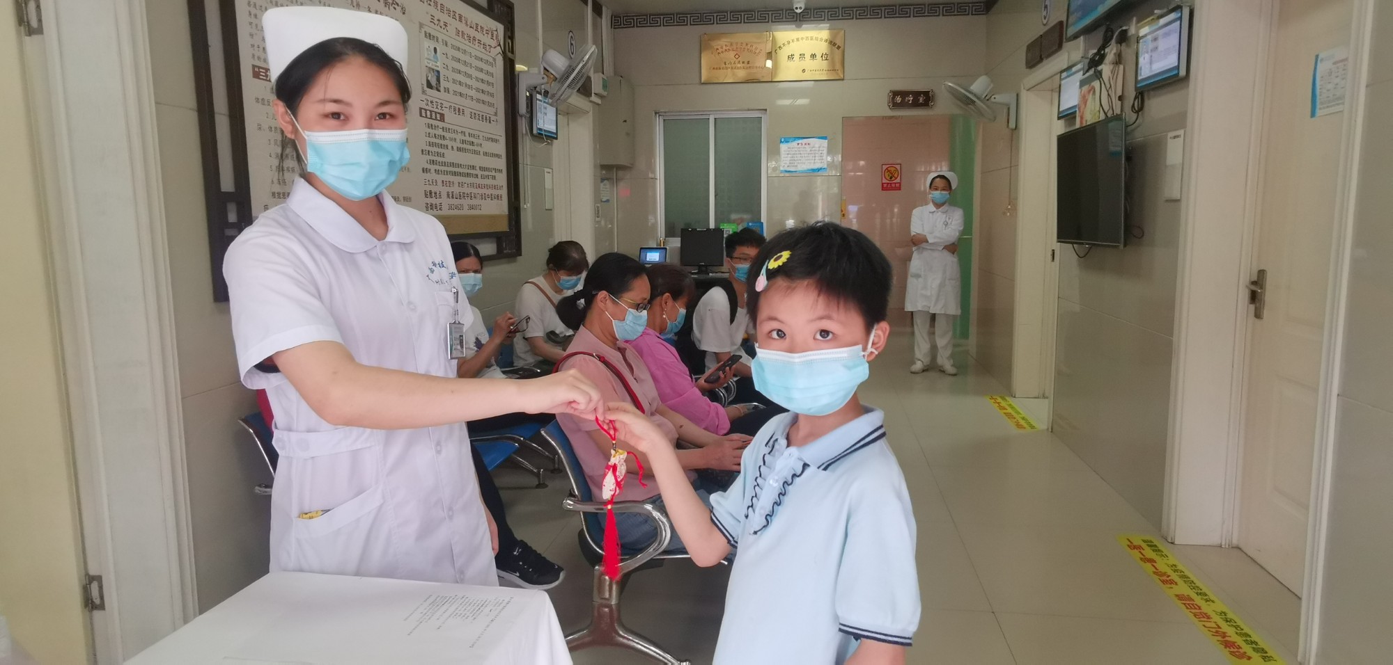 6月1日,南溪山医院中医科护士向就诊小朋友赠送驱蚊香囊,祝节日快乐!张超群 摄