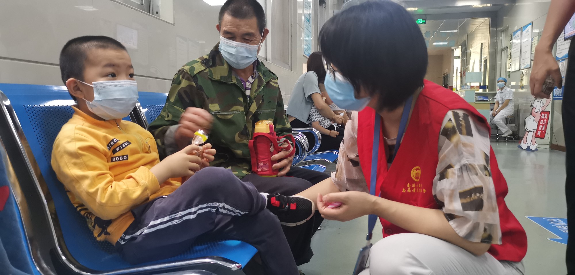 6月1日,南溪山医院团员志愿者在儿科门诊为就诊的小朋友赠送节日礼物。张超群 摄