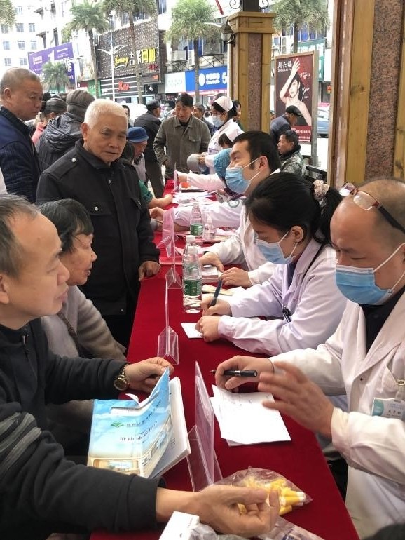 3月21日,广西壮族自治区南溪山医院与兴安县中医院在兴安县街头联合开展糖尿病义诊活动,组织内分泌科医护人员为当地老百姓免费测量血糖、血压,普及疾病常识,传播健康理念。