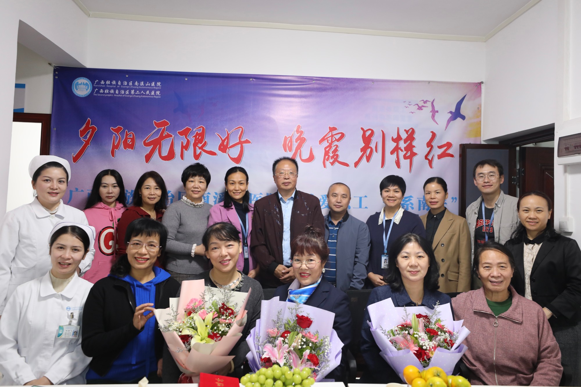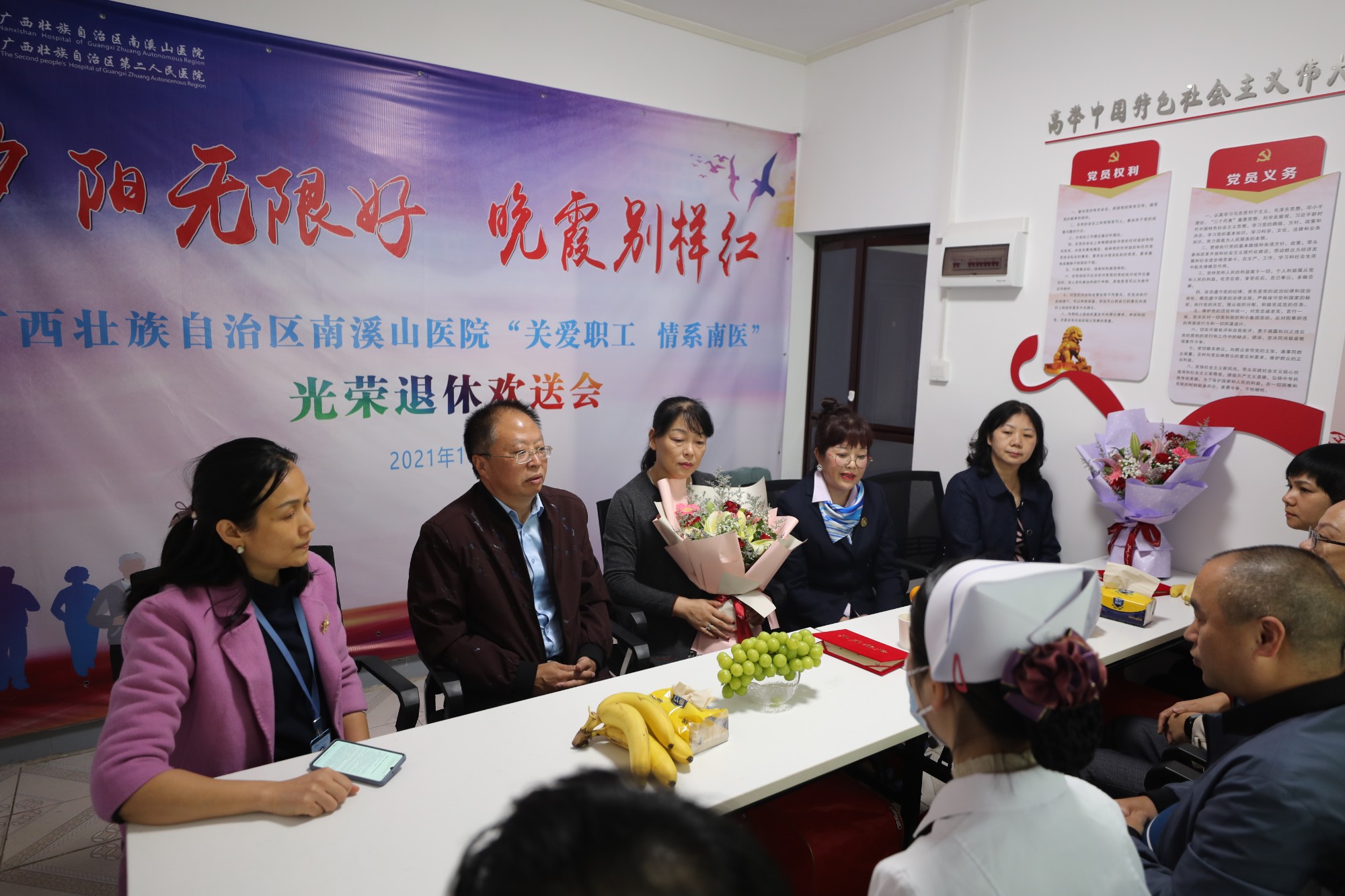 “我在医院已经工作了三十五年,今天医院党委和工会特意为我们准备了仪式感满满的退休欢送会,表明了医院对我们到龄退休职工的关心与关爱,我心里特别感动,退休后也希望能发挥自身余热,继续为医院发展贡献力量!”广西壮族自治区南溪山医院前护理部主任黄颖健感慨道。10月27日,南溪山医院为近期到龄退休的四名医护人员举行了"光荣退休”欢送会,医院领导、工会、离退休职工管理科、组织人事科、退休人员原所在科室同事等人员参加活动。