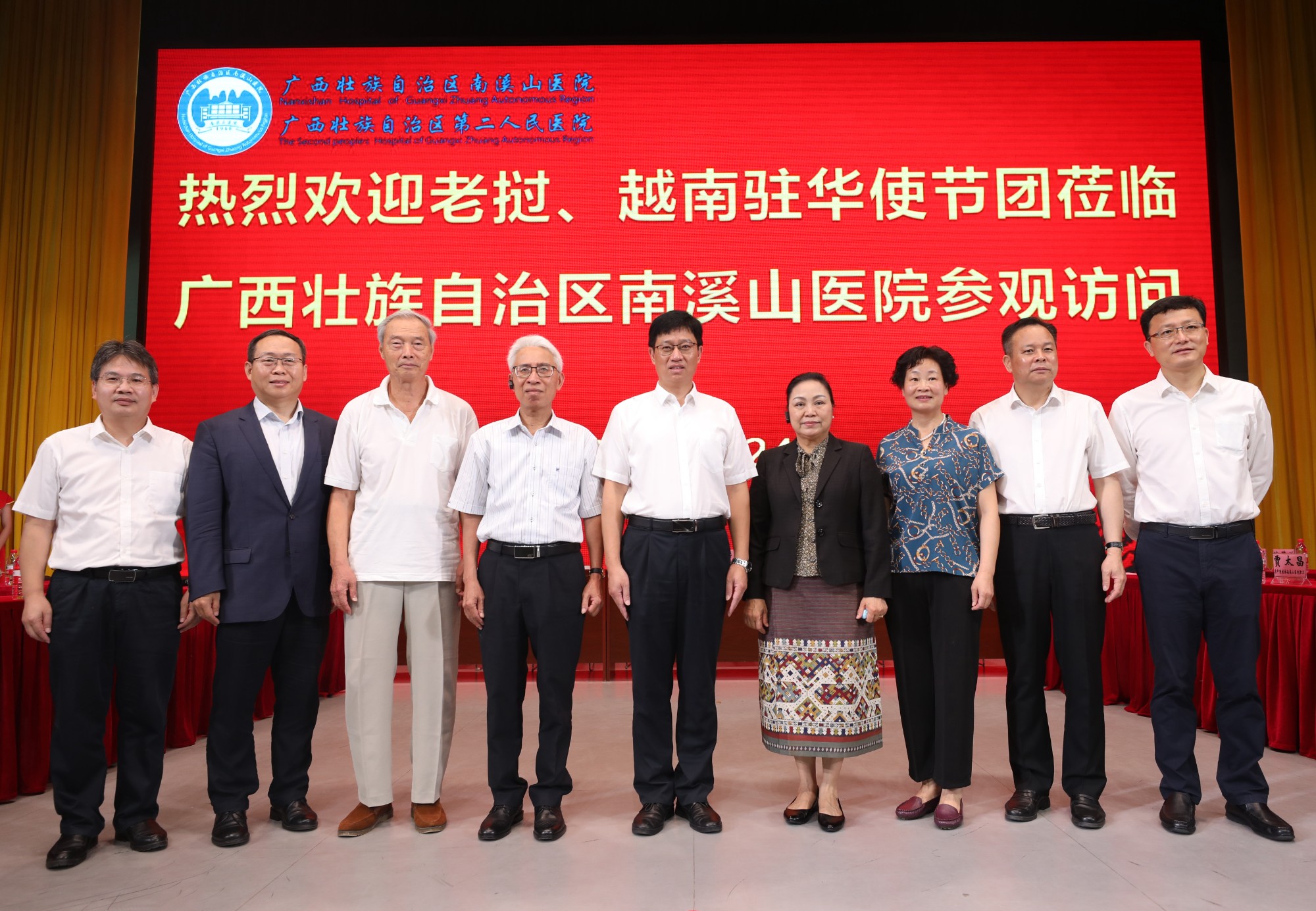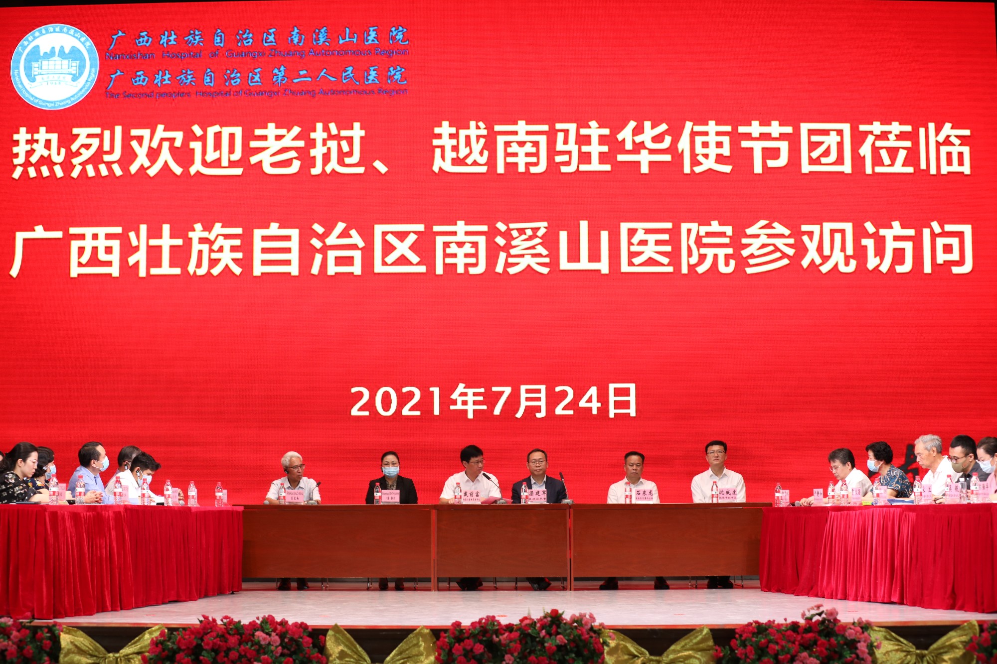 7月24日,老挝驻华大使坎葆·恩塔万带领的老挝驻华使节团和越南驻华大使范星梅带领的越南驻华使节团一行17人到自治区南溪山医院参观交流,外交部亚洲司参赞梁建军、自治区外事办主任石东龙、桂林市副市长沈威虎等陪同。