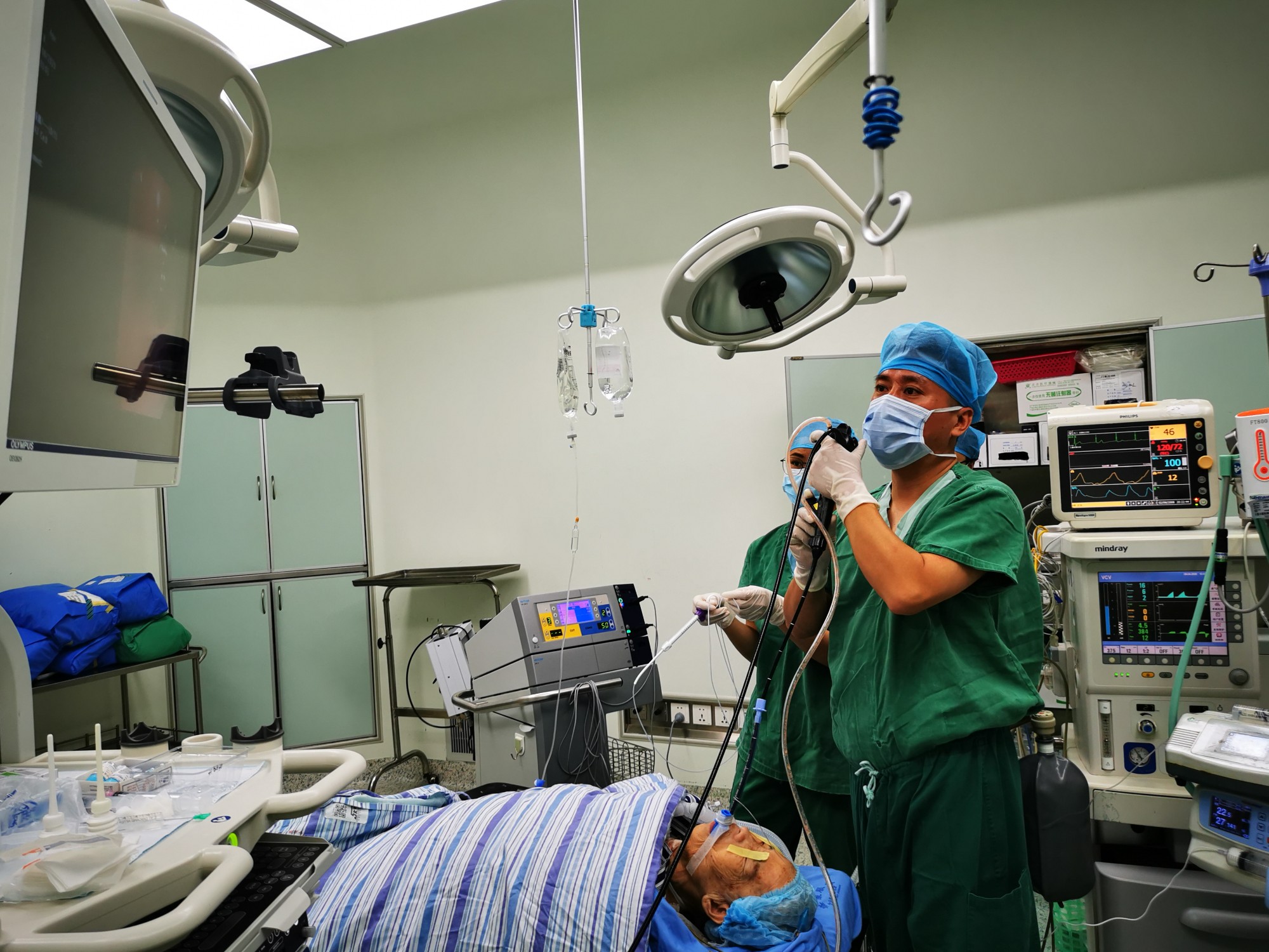 2020年6月23日,龙胜县一名老人不慎误吞一块约5×5.5cm大小的猪脚皮,卡在气管隆突上,出现了严重地呼吸衰竭,呼吸次数达40次/分以上,还频繁出现长达数分钟的呼吸暂停,如不马上进行呼吸介入手术,患者的生命随时可能终止。收到当地医院求援信息后,佘巍巍立即驱车前往100多公里外的县医院参加抢救。到达病房后,他才得知当地医院无异物篮和异物钳等,只有一条老式纤支镜,加之异物为腐烂不易夹的猪脚皮类物。在简陋有限的条件下,佘巍巍医师灵机一动,决定采用吸引的办法,创造性地采用胃管连接吸引器在气管内吸引,并借用消化内镜的活检钳。经过近3小时的操作,最后异物被胃管吸住,与气管导管一起被拔了出来。随着异物被取出,患者顺利度过了危险期。重获新生的患者对佘巍巍的救命之恩感激不尽,县医院同行对佘巍巍博士临危不乱和大胆创新赞叹不已。在龙胜县医院完成手术后,佘巍巍又连夜赶回桂林,第二天早上他又准时出现在医院的工作岗位上。