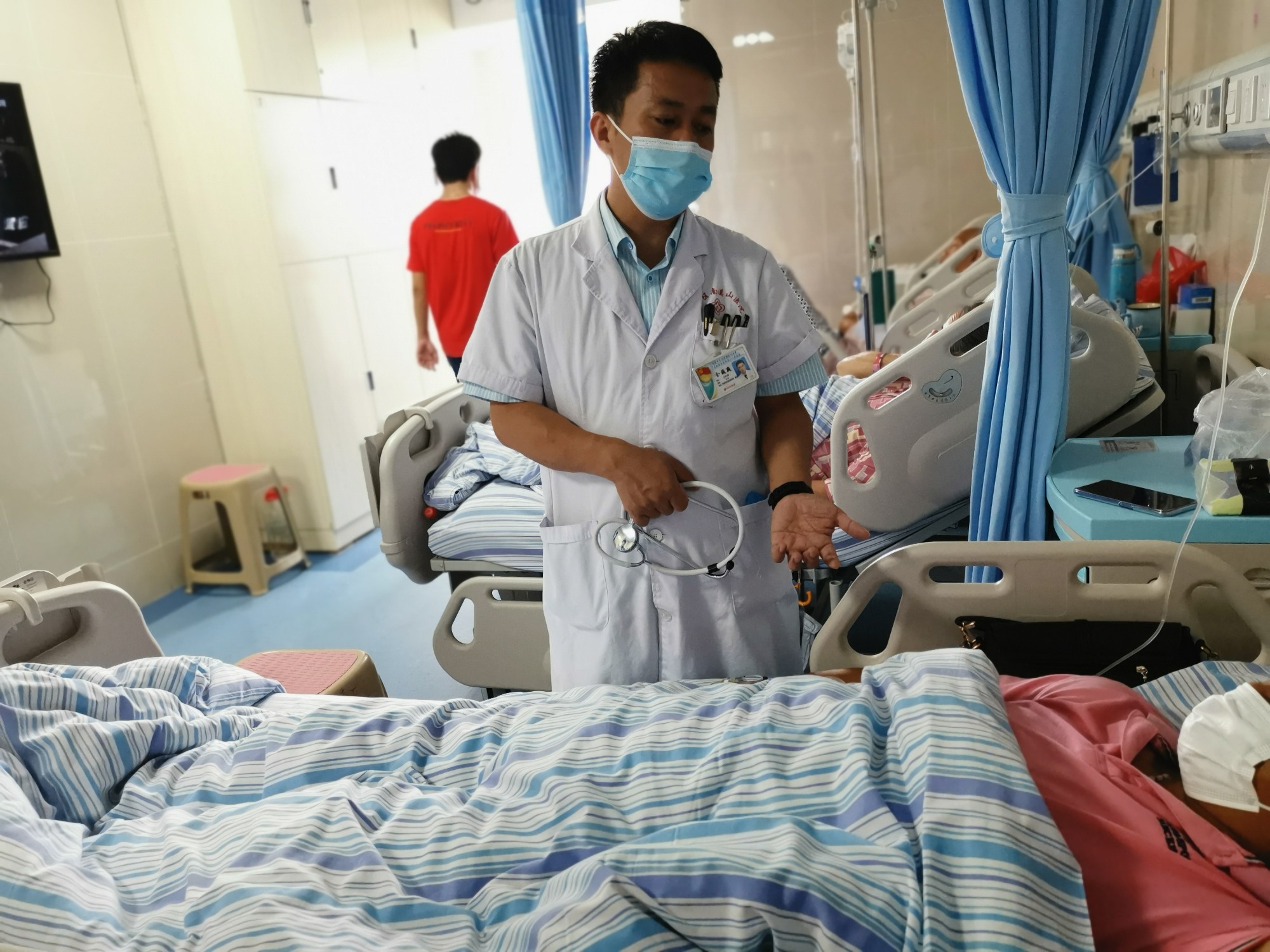 “今天是医师节,我和我的同事都感到很高兴、很开心!今天早上一上班,院长就带领工会的同志来到科室慰问,不仅为我们送来了蛋糕,还给送来了节日的祝福和鼓励。国家专门设立医师节,体现来了党和政府、社会对医生工作的尊重和关心,对我们医师来说是一种鞭策、激励。作为一名呼吸与危重症学科的医师,我一定会努力践行卫生职业精神,善待每一个病人,用自己技术救病人于生死,不负医生这个职业的光荣责任”。8月19日上午,在第四个中国医师节当天,广西壮族自治区南溪山医院呼吸与危重症学科学科带头人、一病区科主任、主任医师佘巍巍博士在谈到中国医师节和一名医生的责任时显得非常激动。同时,他还利用工作间隙,向笔者讲述了几个他关爱病人、救死扶伤、服务群众的感人故事。