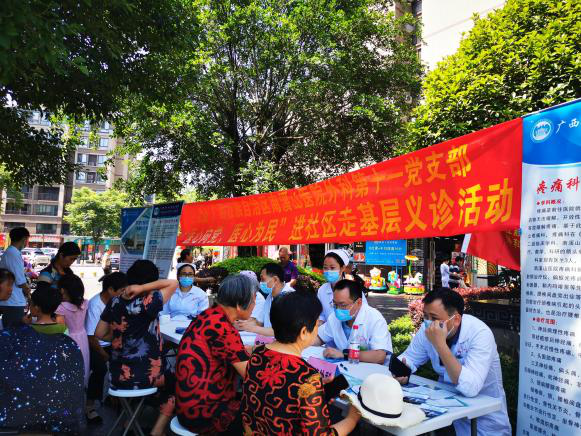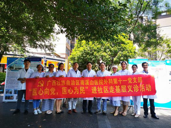为庆祝建党100周念,深入推进“健康桂林,南医先锋”党建品牌建设,6月6日,广西壮族自治区南溪山医院外科第十一党支部在象山区悠山郡小区开展了“医心向党,医心为民”名医名家进社区走基层义诊活动。