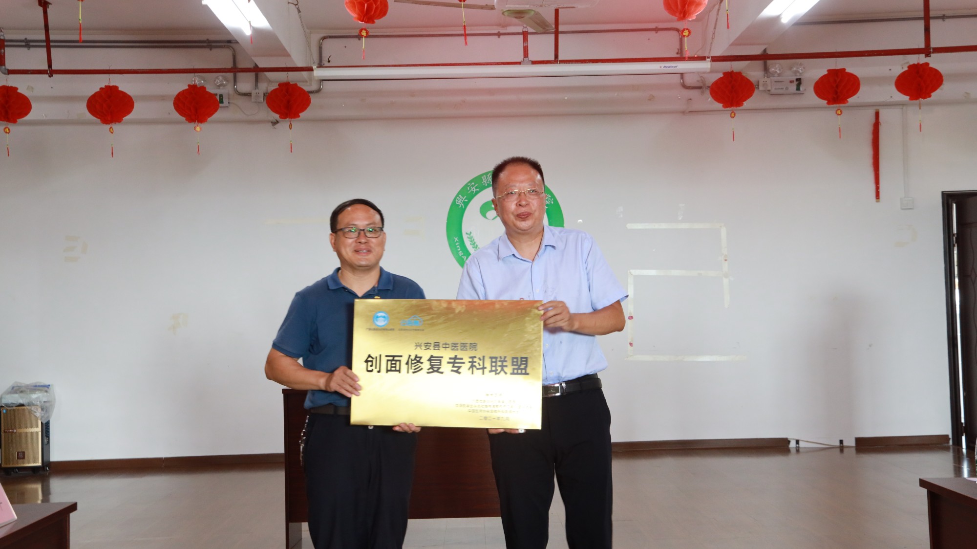 南溪山医院领导向兴安县中医医院院长(左)授专科联盟牌匾--彭馨仪 摄