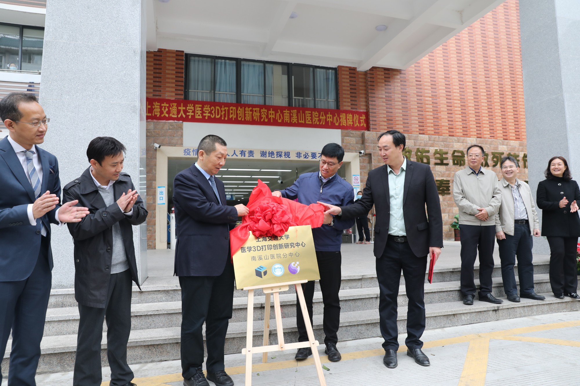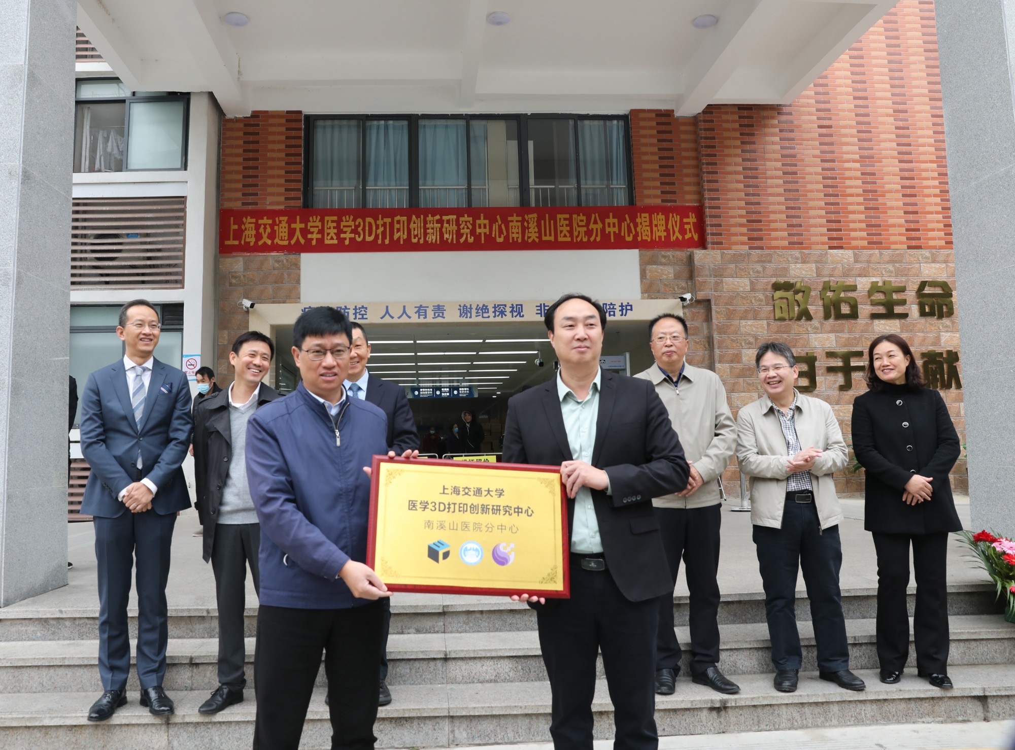 揭牌仪式上,上海交通大学医学院附属第九人民医院的郝永强教授分别为南溪山医院院长刘宇军、副院长李朝旭颁发分中心主任、副主任聘书;并与该院党委书记戴前富、院长刘宇军共同为上海交通大学医学3D打印创新研究中心南溪山医院分中心揭牌。