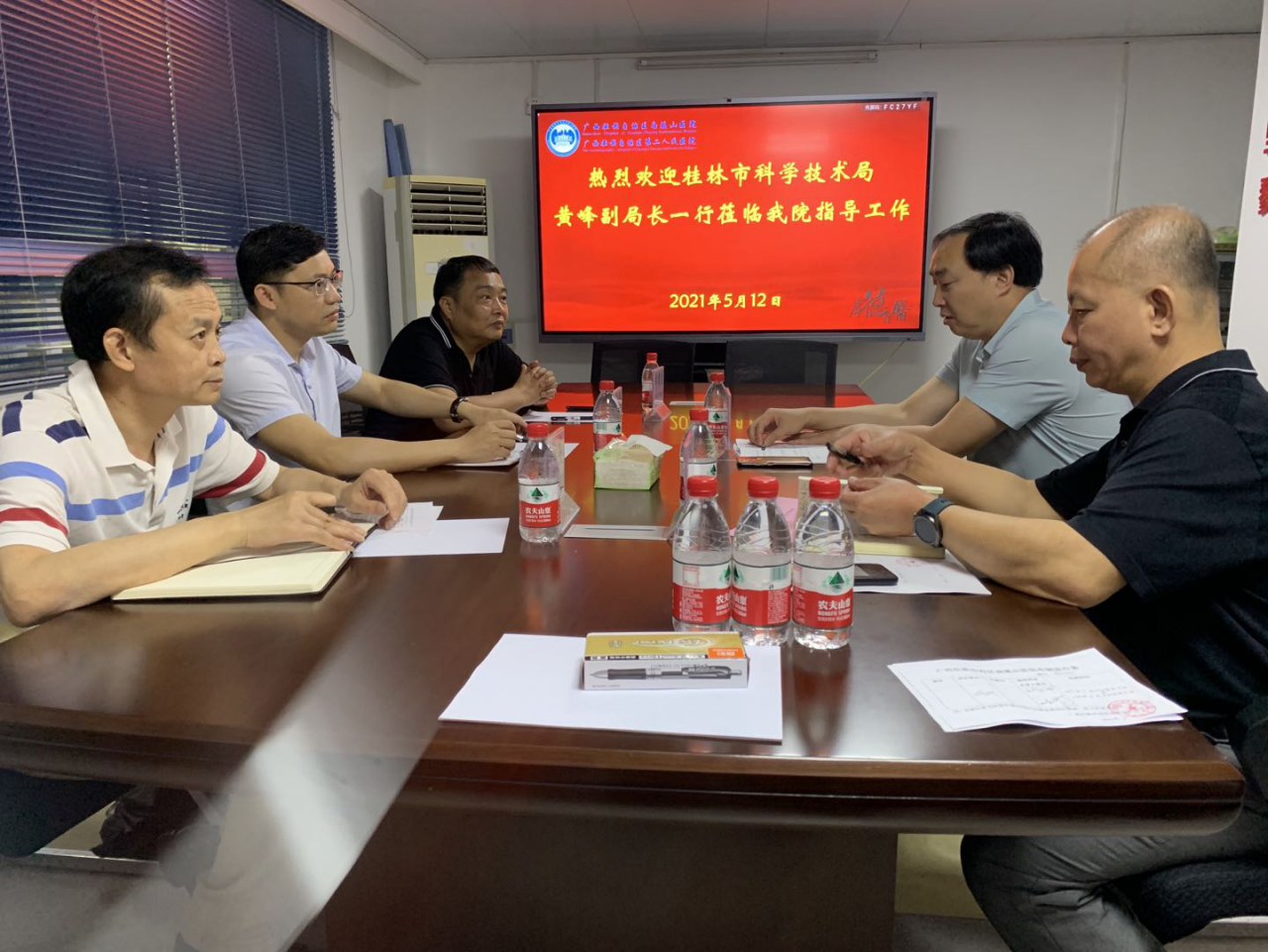 5月12日上午,桂林市科学技术局党组成员、副局长黄峰到自治区南溪山医院指导调研医疗机构科研平台建设、科技人才培养及科技项目管理等工作。该院党委副书记、院长刘宇军,科研科临时负责人刘陶文参加座谈交流。