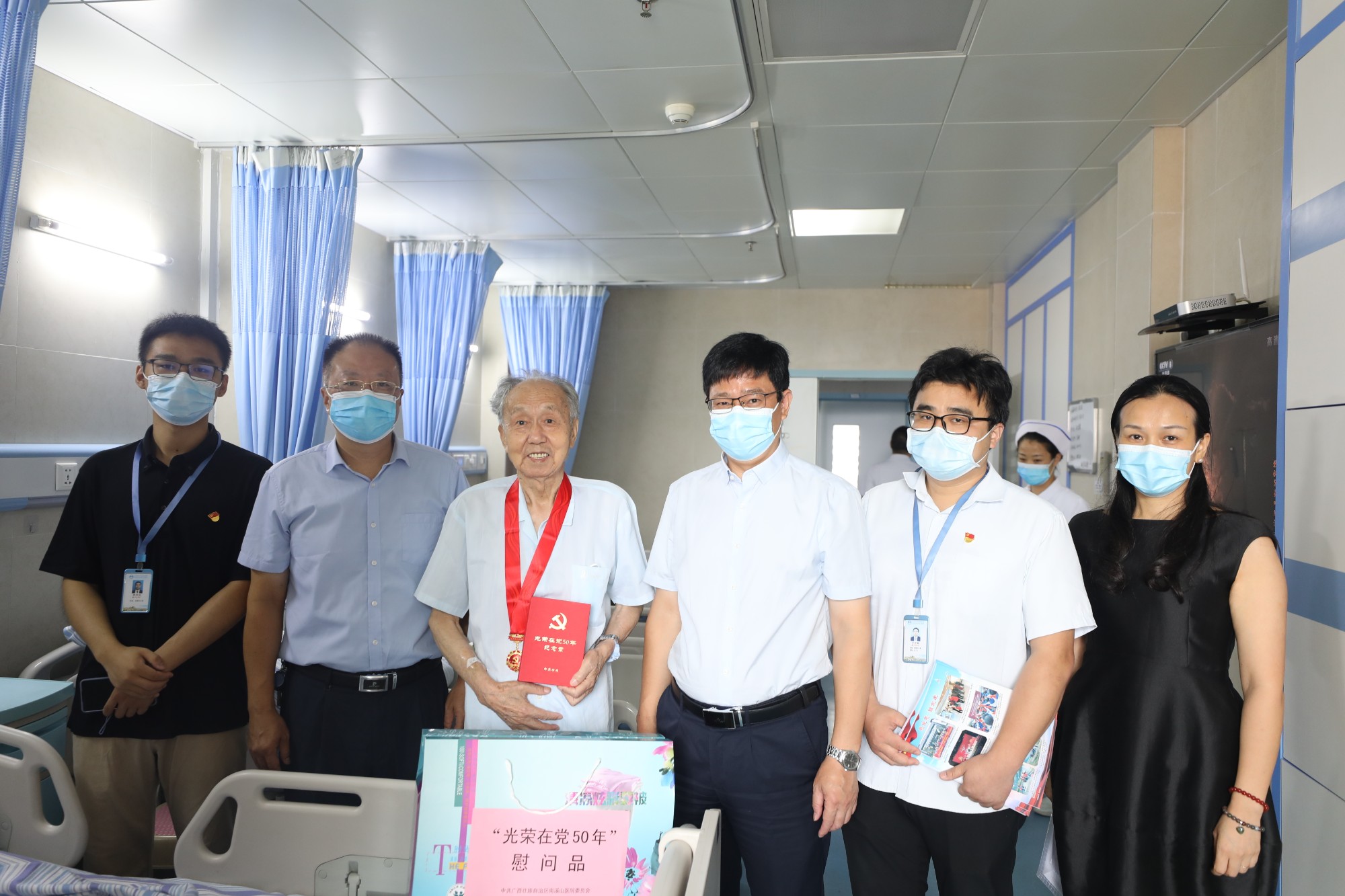 在中国共产党成立100周年之际,6月23日上午,广西壮族自治区南溪山医院党委组织党办、离退休职工管理科党总支、宣传科等科室人员开展“七一”走访慰问活动,为部分生病住院、行动不便、生活困难的老党员送上“光荣在党50年”纪念章、荣誉证书和慰问金、慰问品,向他们致以诚挚的问候和崇高的敬意,感谢他们为党的事业和医院的建设、发展所付出辛勤努力。