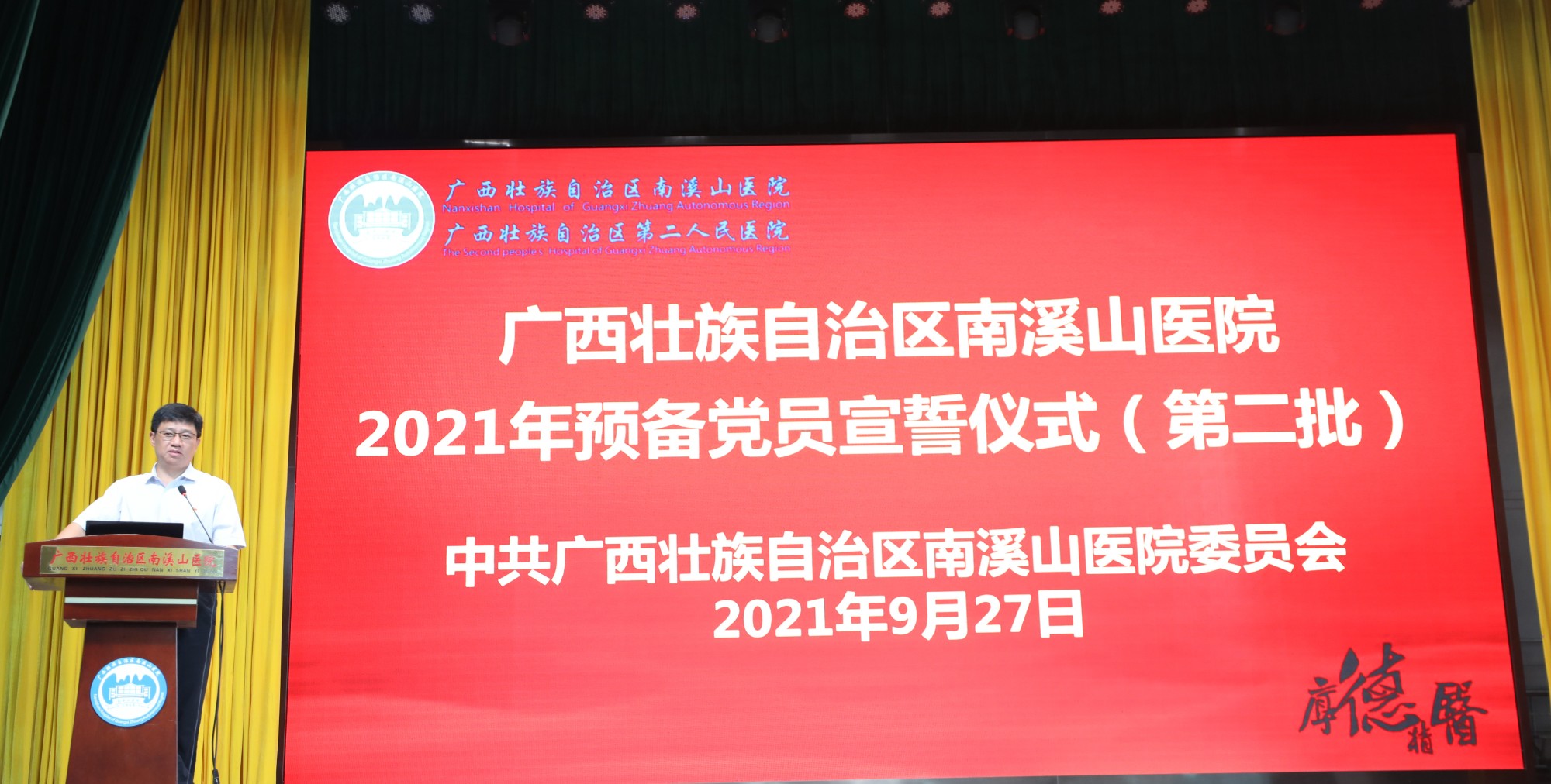 9月27日,广西壮族自治区南溪山医院举行了2021年第二批预备党员宣誓仪式,在该院党委书记戴前富的带领下,12名中共预备党员面向党旗庄严宣誓,为医院党建注入了新活力。该院党、政领导班子成员,各党支部书记、中层干部近200余人参加了仪式。