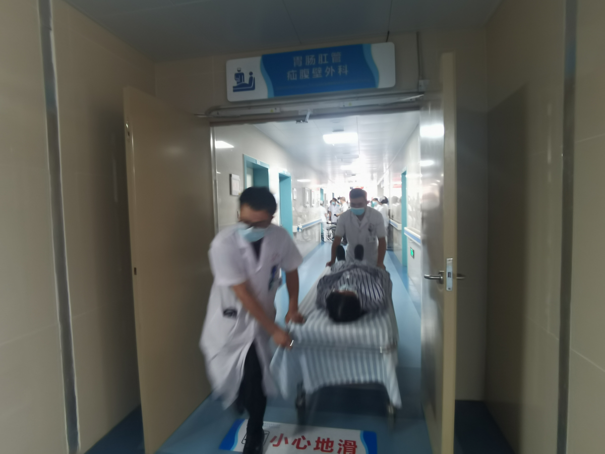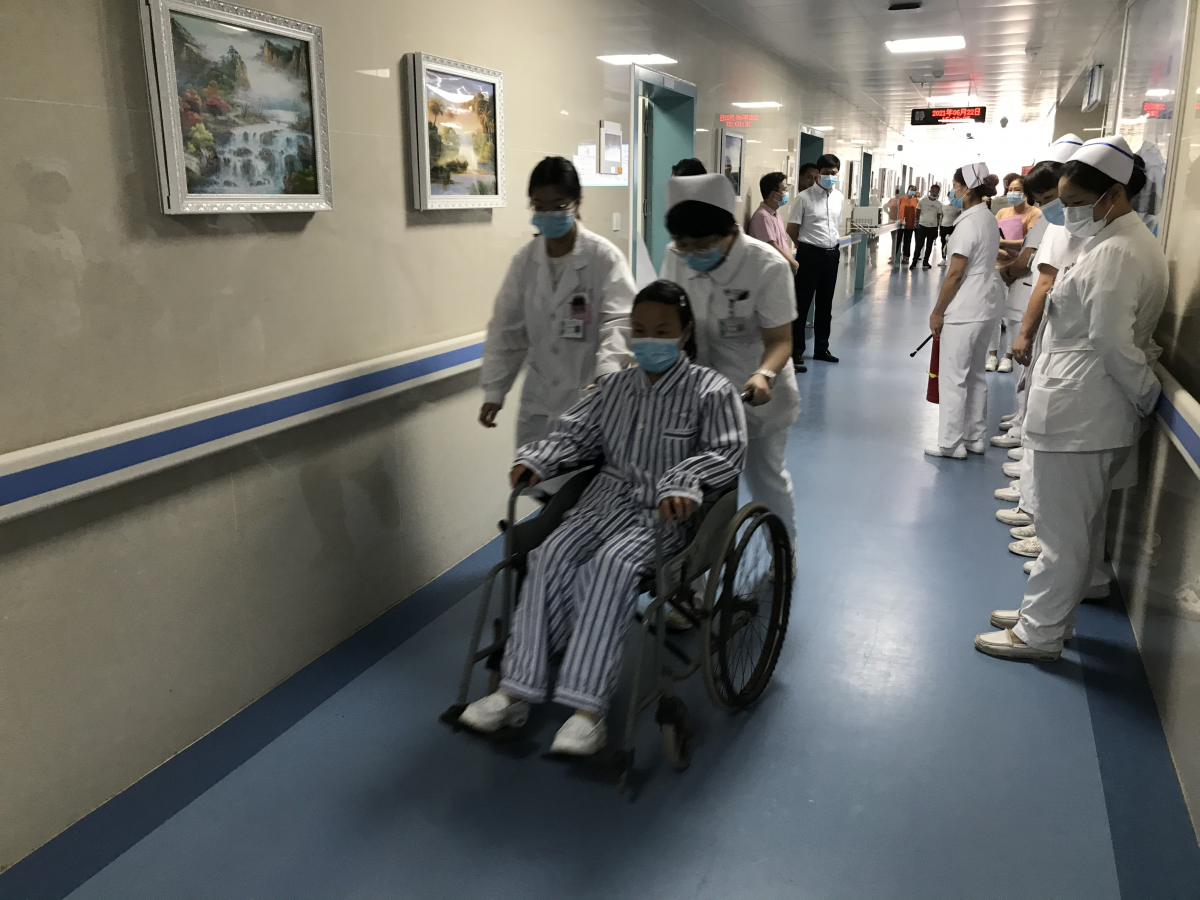 当天下午15时,该院住院部8号楼二楼的胃肠外科传来当班护士呼救:“病房起火啦”,演练正式拉开序幕。当班医护人员在护士长的指导下快速明确分工,组织灭火组和疏散组,关闭电路总闸及氧气开关,对初起火灾进行处置,做好疏散准备,并电话通知医院总值班和保卫科值班,启动消防应急预案。保卫科值班人员接到电话后迅速通知当班保安及微型消防站队员全副武装、携带消防器材前往现场增援,并拨打119报警电话;保安及微型消防站队员到达现场,班长下达任务,灭火组使用灭火器、水枪水带形成第二灭火梯队继续灭火;警戒组负责外围警戒,疏散外围围观群众,禁止无关人员进入火场。象山区瓦窑消防救援站接到报警后立即驱车赶到火灾现场,形成第三灭火力量继续灭火。