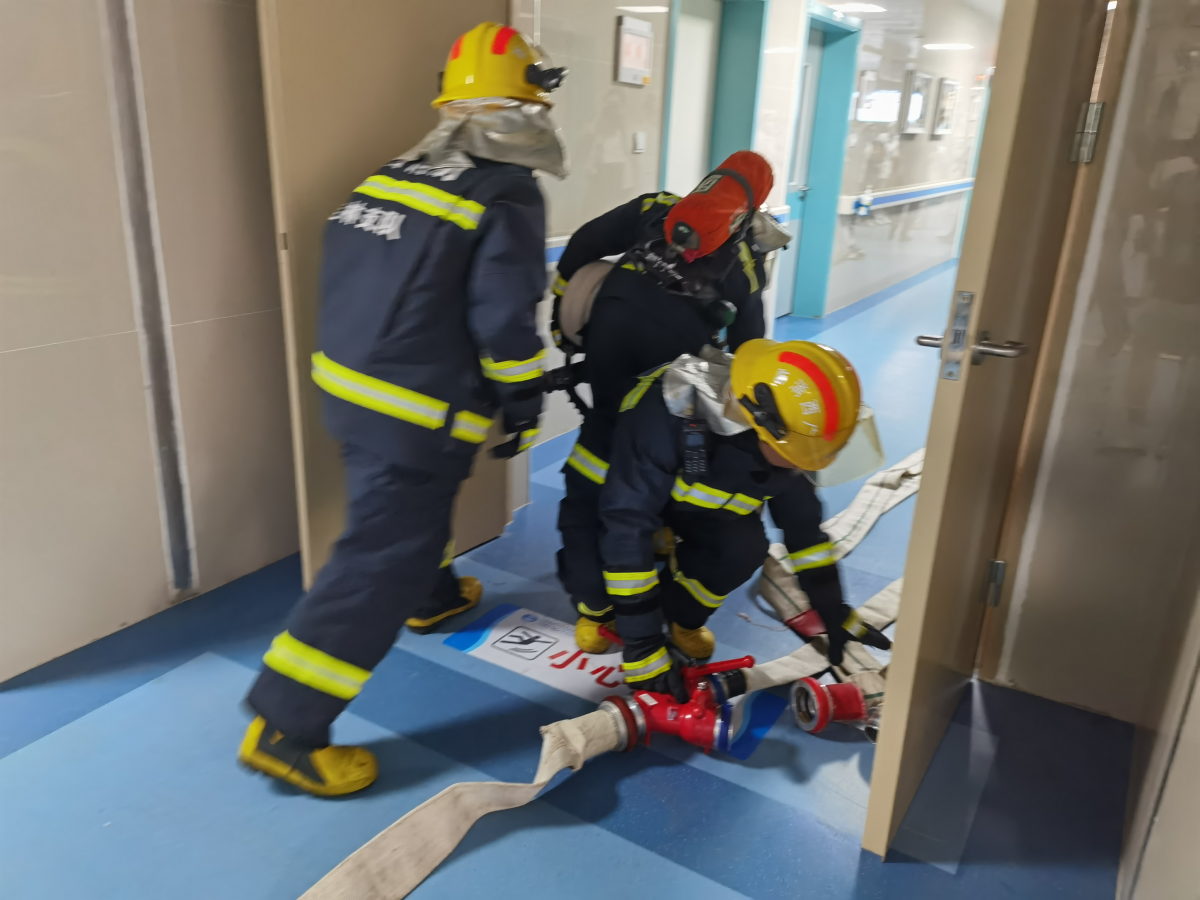 医院微型消防站队员利用灭火器、水枪水带进行灭火
