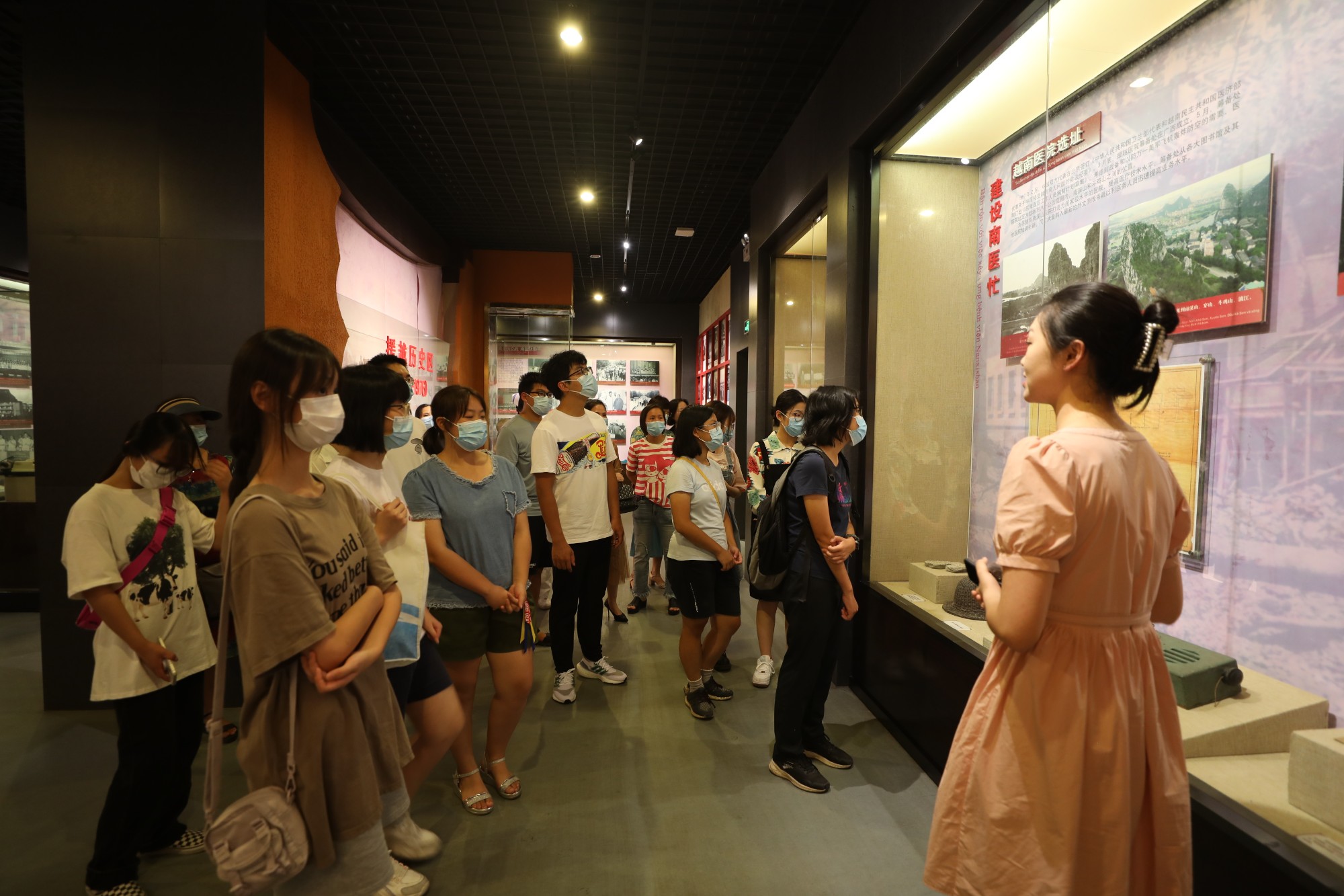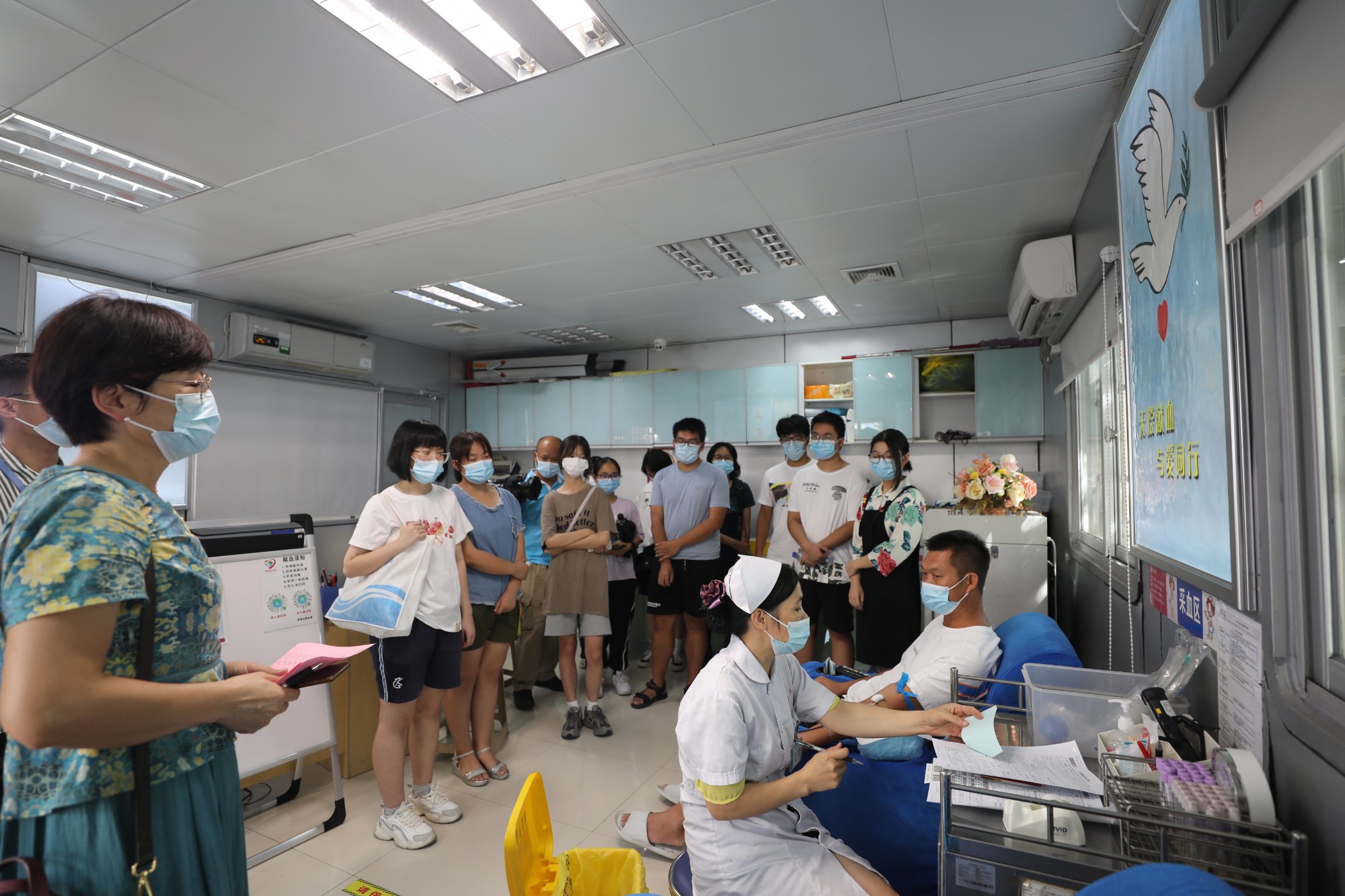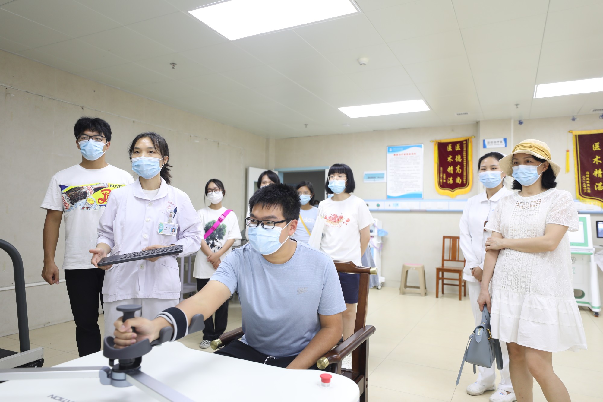 当天下午3点开始,在医院工会等部门负责人的组织引领下,13名大学学子们分成三个组,先后参观南溪山医院院区和他们家长所在的工作岗位。学子们走进父母所在科室,近距离了解父母工作,了解医护人员的工作;他们还参观医院门诊核酸采样区和献血屋,近距离的参观,让这些职工子女们深刻地体会到父母和医护人员工作的辛劳和意义;院史展览馆的参观,使不少从小在南医出生、长大的职工子弟对南溪山医院的历史、文化和“厚德精医,大爱担当”南医精神的形成有了更全面深刻的了解,他们在感受医院丰富的红色革命文化历史的同时,对自己作为一名南医子弟感受无比的骄傲、自豪。