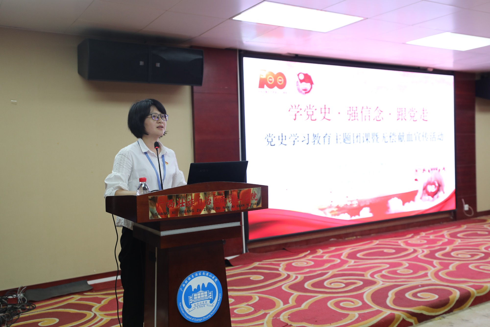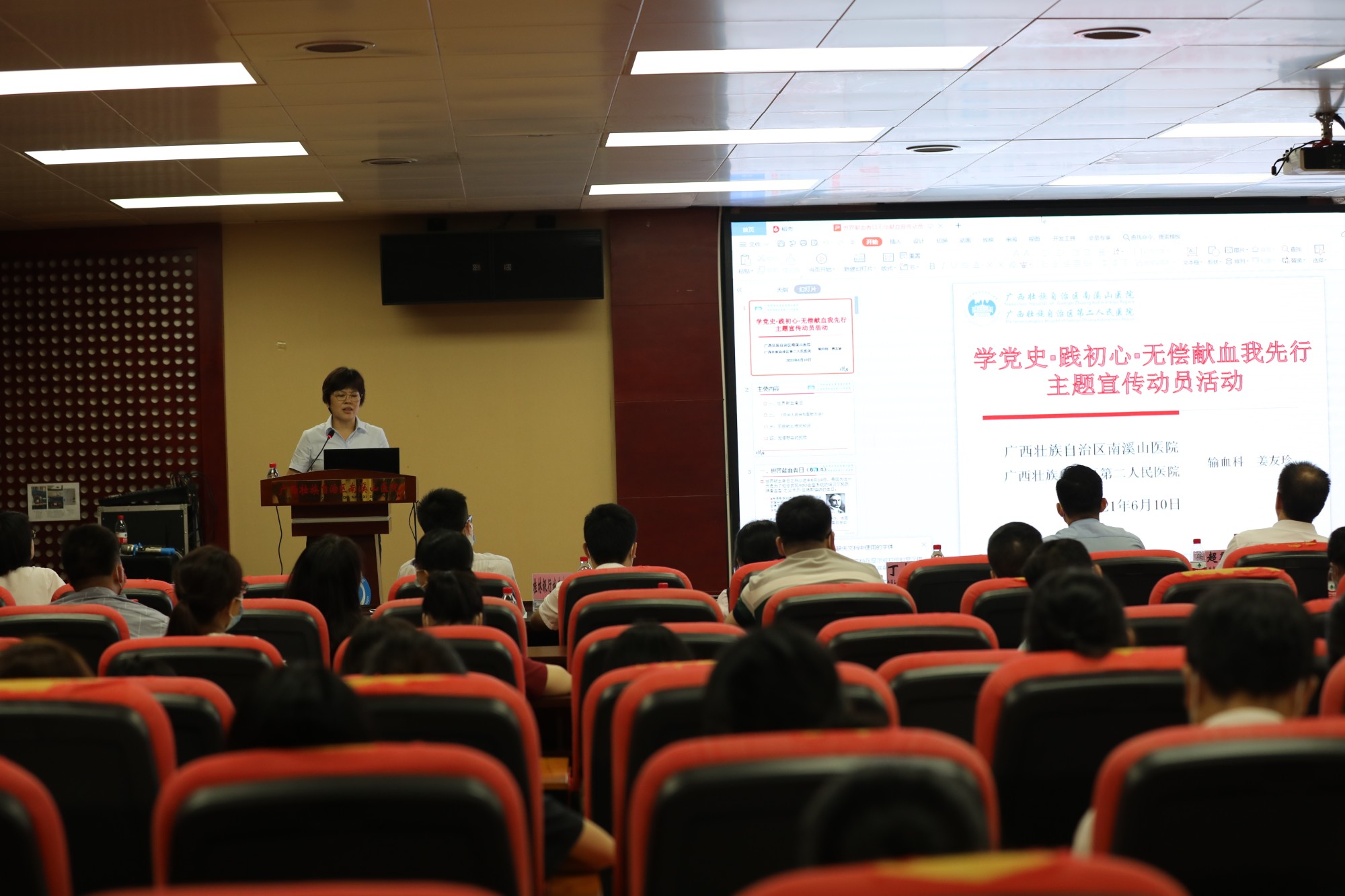 6月11日晚上,广西壮族自治区南溪山医院团委、输血科联合组织开展的“学党史 强信念 跟党走”党史学习教育主题团课暨无偿献血宣传活动在医院学术报告厅隆重举行。医院党委副书记、工会主席张超群、输血科主任姜友珍及医院团委委员、团员青年代表等100余人参加了活动,同时,还邀请了周边友好单位碧园南溪新城、桂林银行城南支行团委的团员青年参加,活动内容丰富,让在场团员青年接受了一场浸润式的精神洗礼。