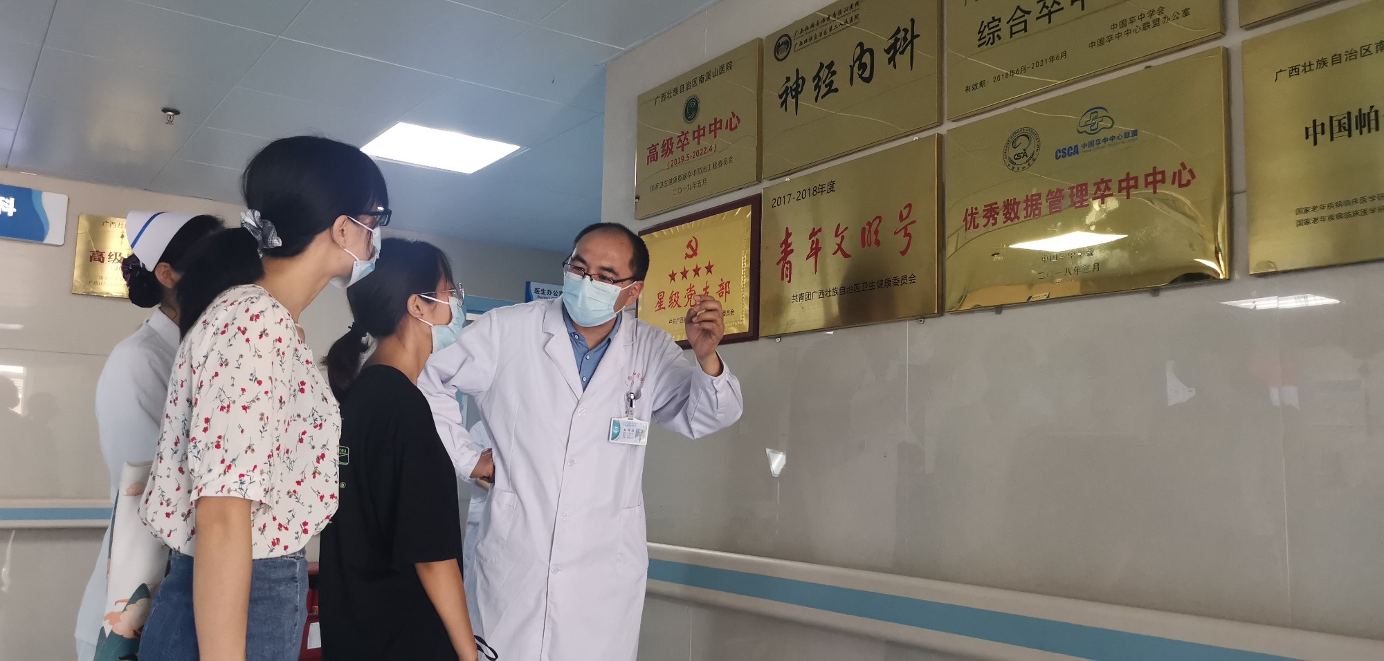 南溪山医院领导为桂林师专师生讲述医院的抗疫故事。南溪山医院神经内科主任张艳波博士向资助的学生介绍科室情况,鼓励她勤学习,用知识改变命运。张超群 摄