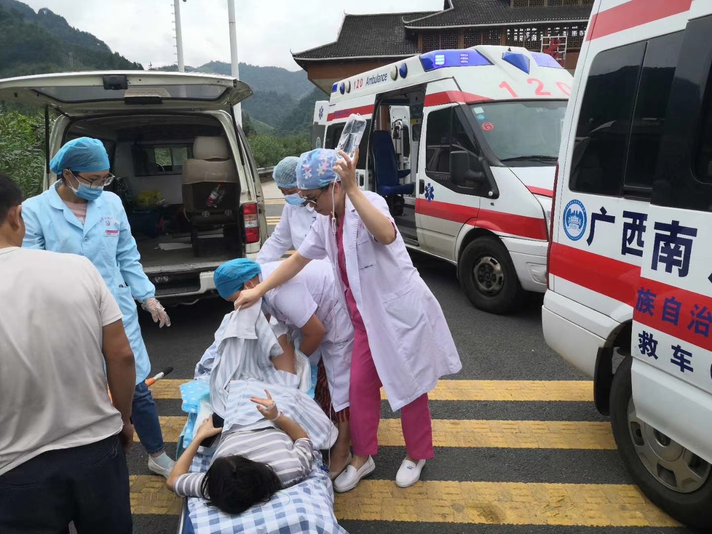 南溪山医院的救护车在龙胜县至桂林市的高速公路入口接到了龙胜县妇幼保健院送来的孕妇及随行家人