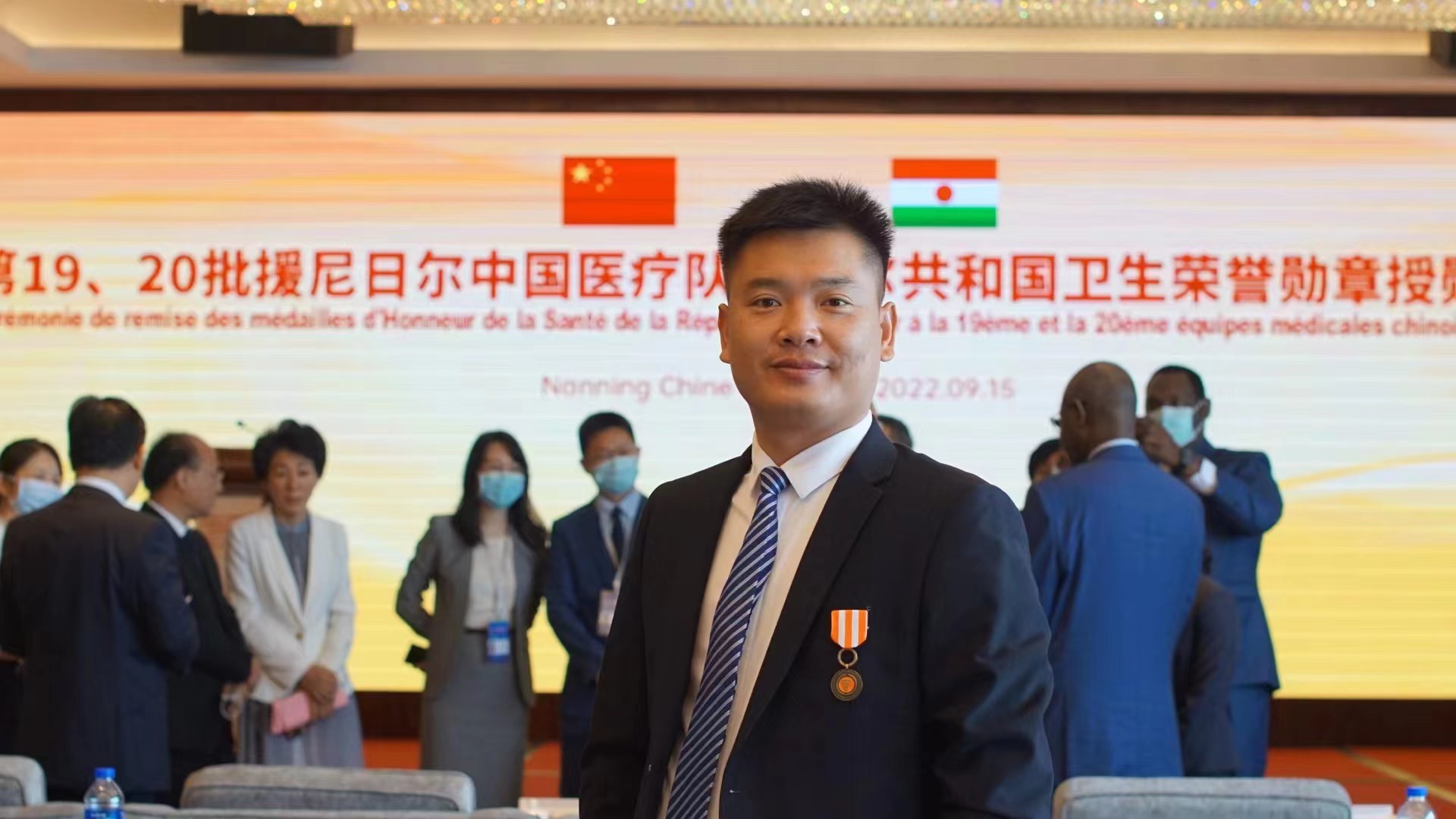 9月15日,第19、20批援尼日尔中国医疗队尼日尔共和国卫生荣誉勋章授勋仪式在广西南宁市举行。尼日尔驻华大使伽尔巴·塞尼代表尼日尔总统向第20批援尼日尔中国医疗队队长、南溪山医院副院长蒋广元颁授金质勋章,向该院其余两位队员罗秀锋、宾小昌颁授铜质勋章,为南溪山医院国际主义历史传承再添新篇章。