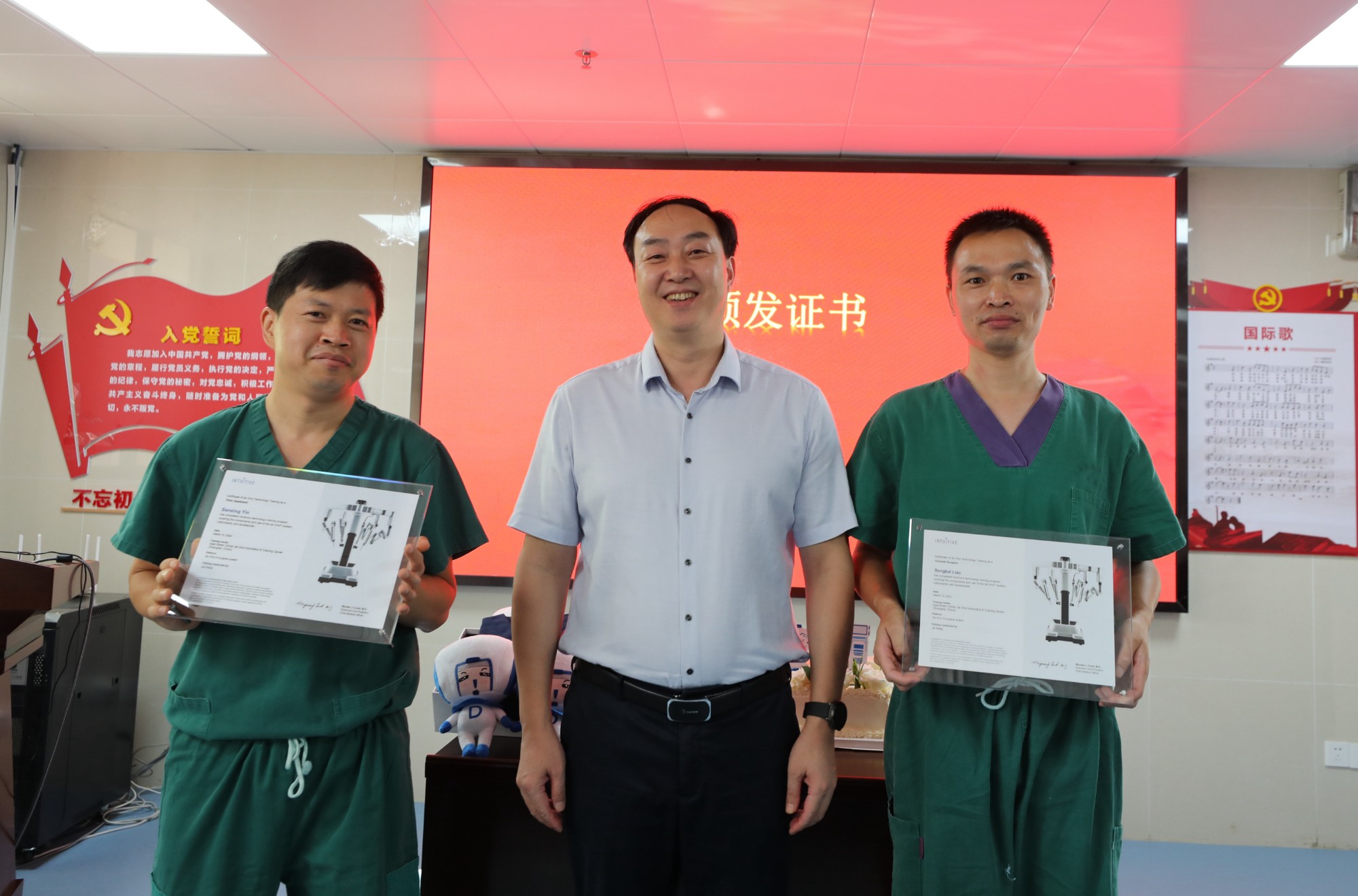 南溪山医院党委书记戴前富向泌尿外科颁发100例达芬奇手术纪念杯