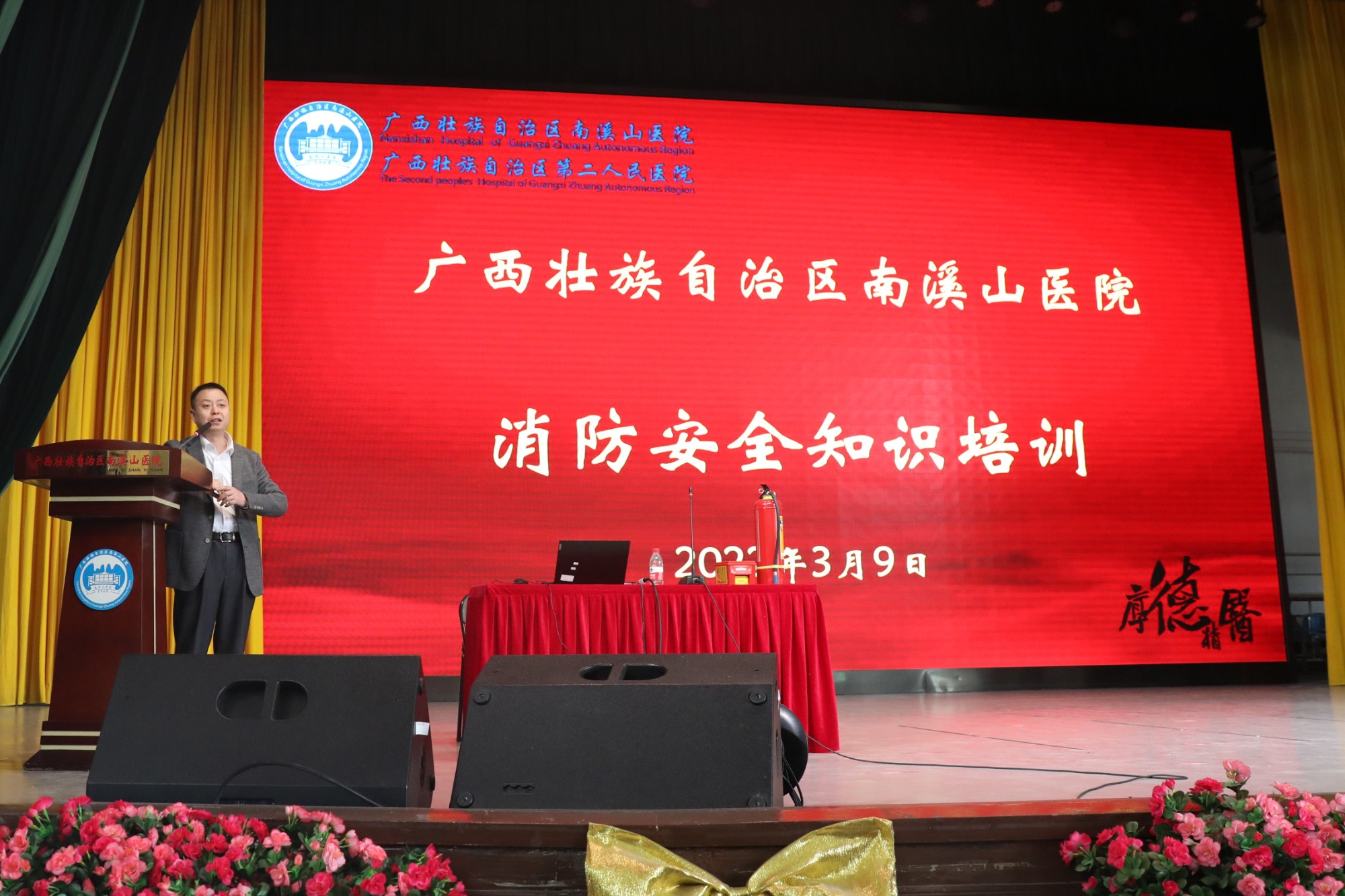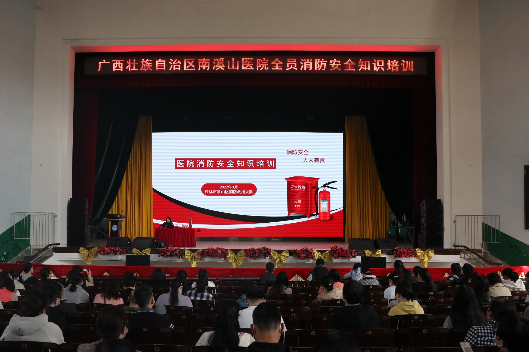 为进一步增强医院医护人员的消防安全意识,提升正确应对突发火灾的应急处置能力,3月9日下午,广西壮族自治区南溪山医院组织全院职工在医院大礼堂开展消防安全知识培训并进行现场演练。