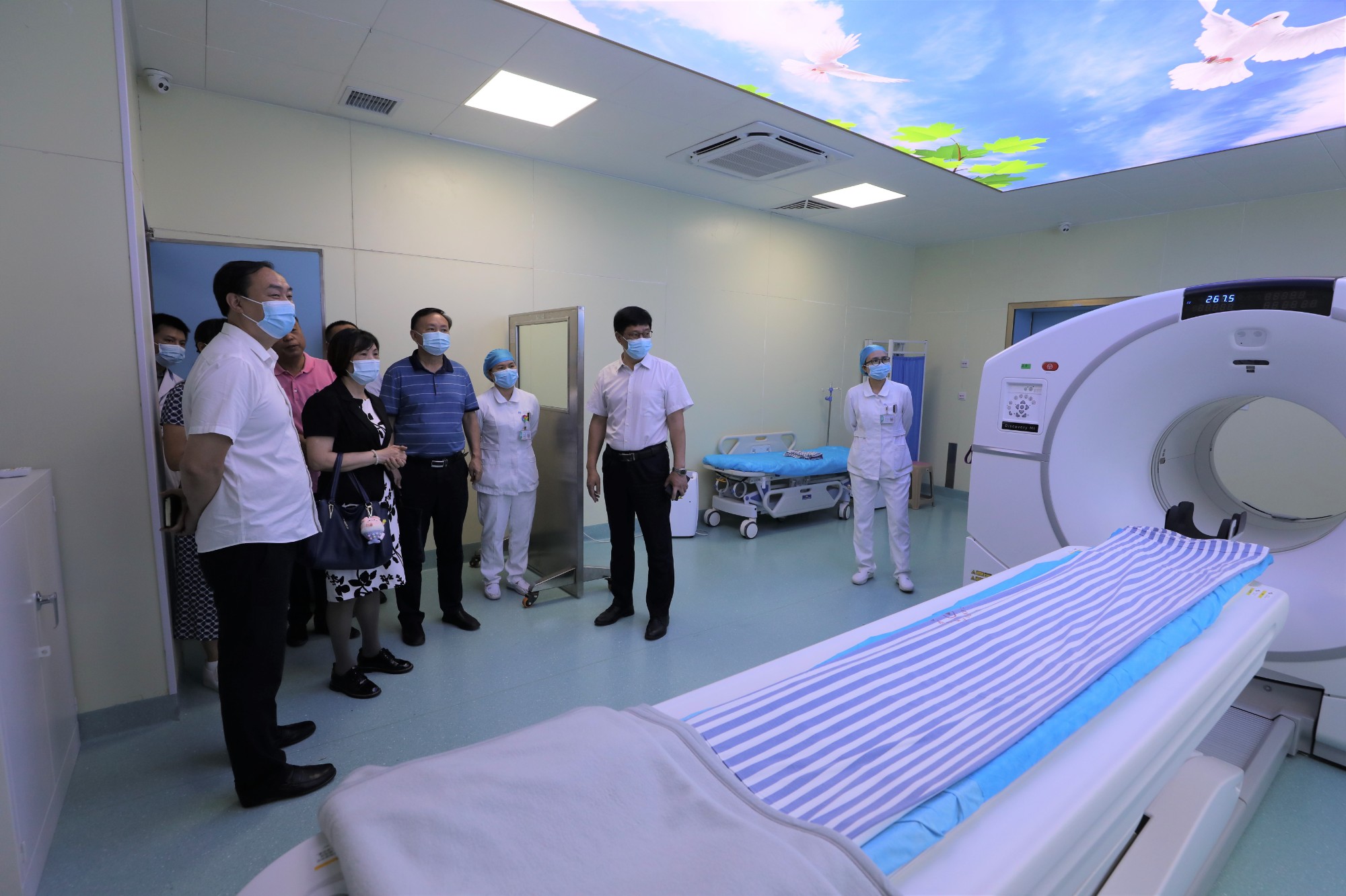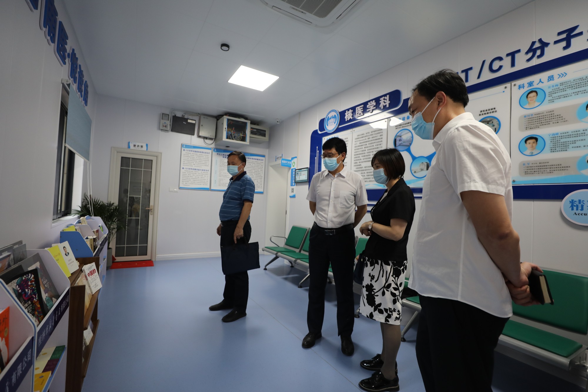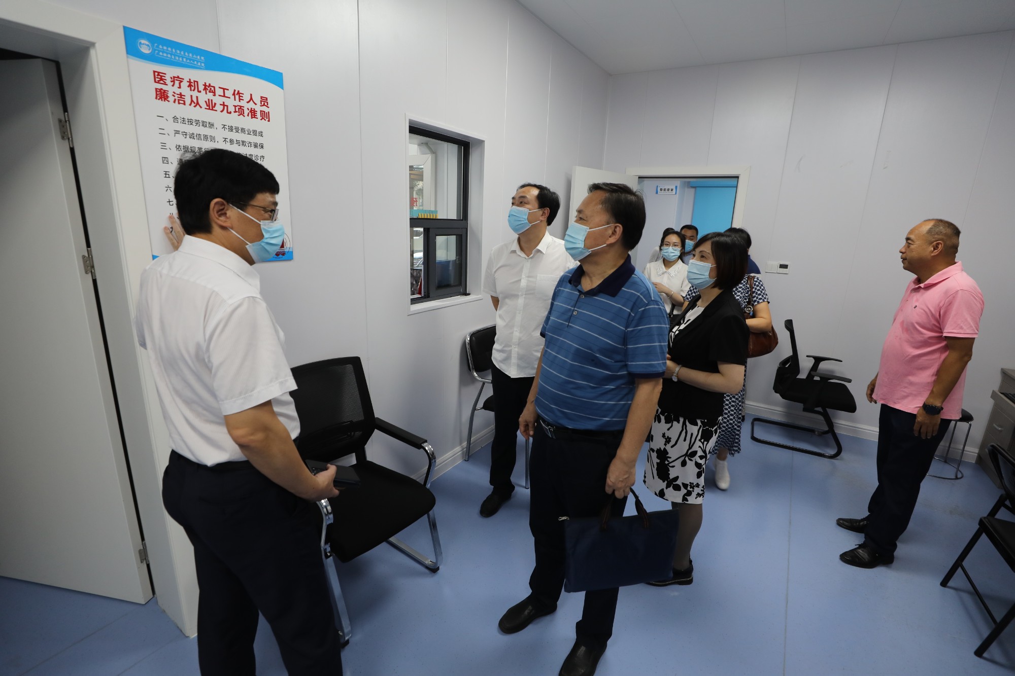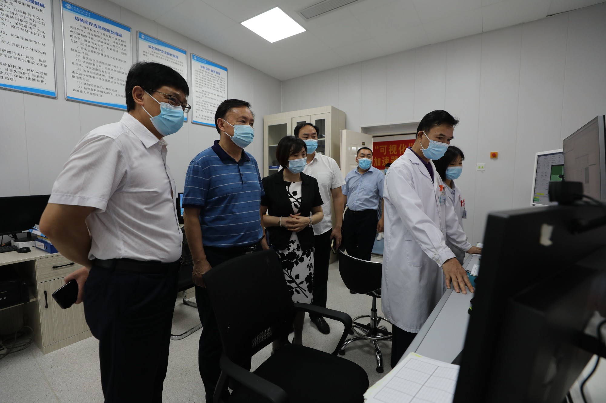 调研过程中,王建政一行先后来到发热门诊、历史文化长廊、职工食堂、科研教学楼、核医学科、放射治疗科、配套综合楼,同时参观了直线加速器、PET/CT分子影像中心等医院先进的医疗设备,走进该院法治办公室进行了实地考察,参观了科室党建宣传栏、阅读角等建设。该院各个科室都张贴了廉洁从业九项准则的标识,沿路都可以看到关于依法治院的相关宣传,不断引导全院职工遵纪守法,让法治建院深入人心,让大家深切感知国家安全和个人安全密切相关。
