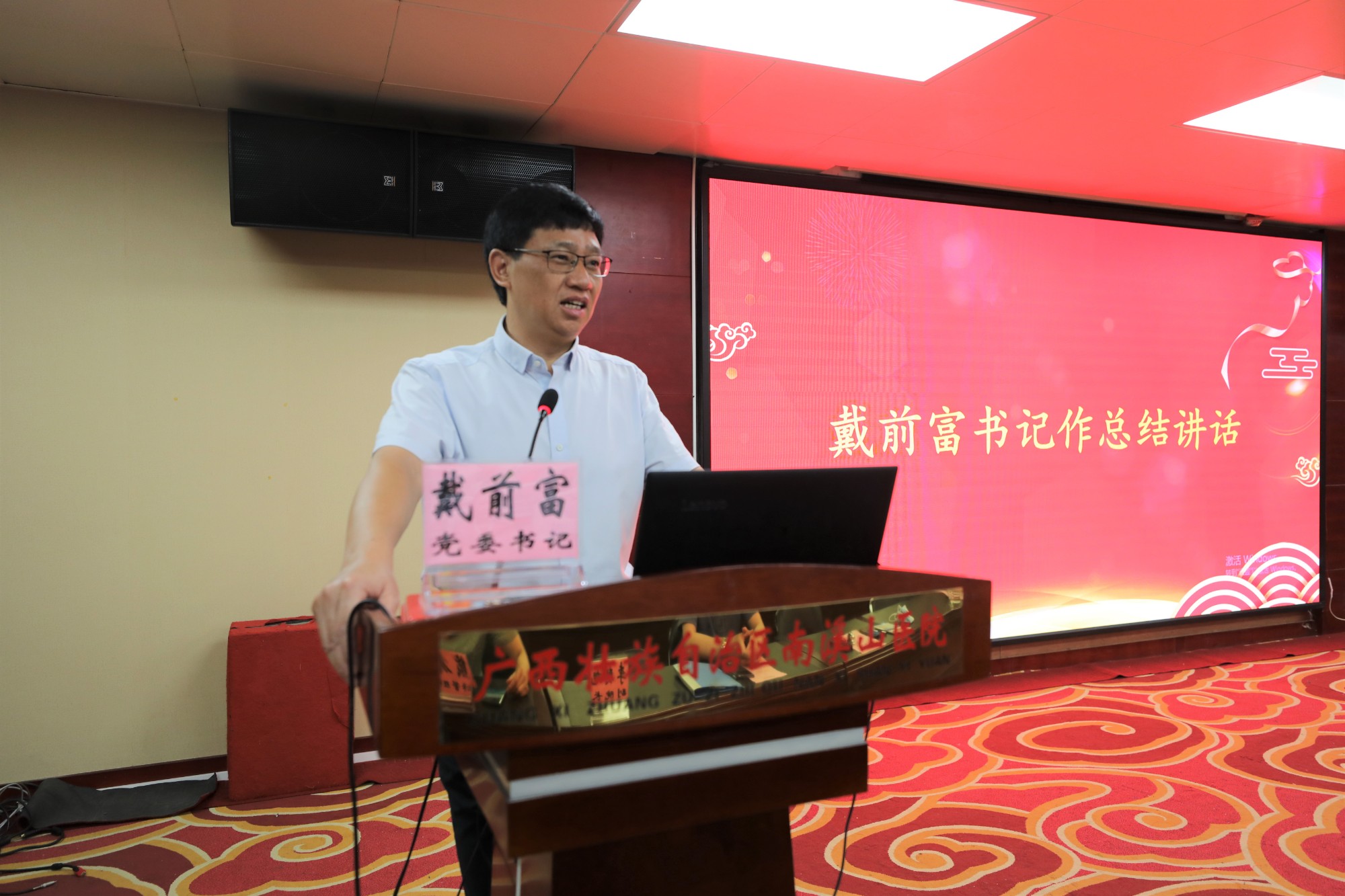 党委书记戴前富在总结中表示,学员们通过三年时间的努力学习,如今已经完成各项任务顺利结业,即将告别南溪山医院,独立地面对这复杂的社会,从南溪山医院带走的不仅仅是知识、能力和记忆,更将带走的是将与你们相伴一生的南医精神,要学会感恩这一段难忘的岁月。他强调,学员们要牢记“四颗心”,第一颗心是对党的衷心,作为党的大夫、人民的大夫、百姓的大夫,就要对党衷心,让党放心;第二颗心是医者仁心,把生命作为至上的目标,把服务对象作为至上的目标 ,无愧于当年走进医院许下的誓言、无愧于身上的白大褂;第三颗心是学习的恒心,走入社会以后要坚持学习,学到老,活到老。用学习铺垫医学基础,用学习夯实医务基础,用学习巩固为民服务基础;第四颗心是创新的决心,做好临床工作,不断做好科研创新,坚持创新精神,希望学员们在学医的道路上不忘初心砥砺前行。
