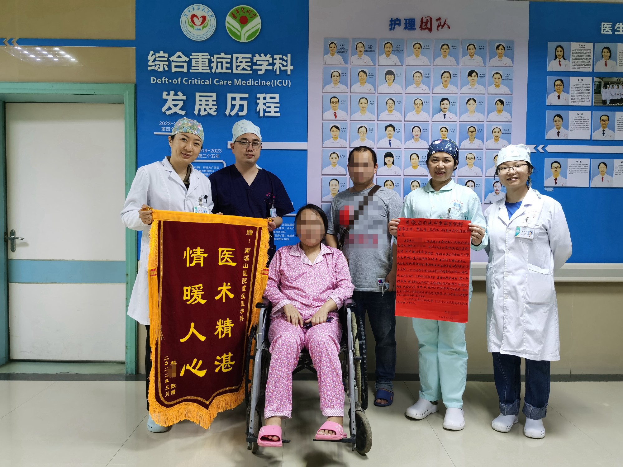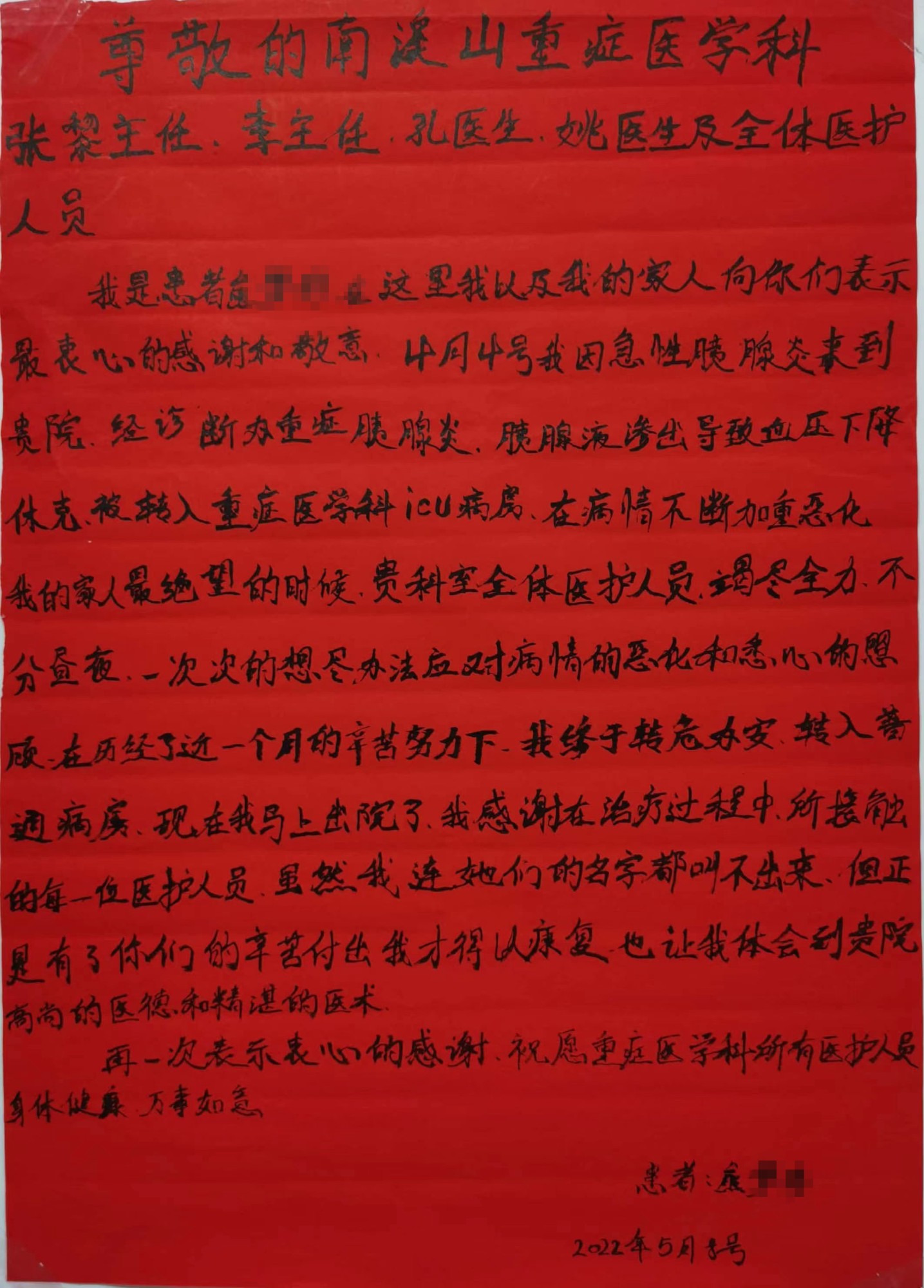 经过综合ICU、消化内科、中医科、超声科近40个日夜的努力和精心照护,熊女士终于好转出院了。她和家人给ICU的医护人员送来了感谢信和锦旗。她动情地说:“在ICU的二十几天里,你们给了我第二次生命,我老公想帮我写感谢信,但是我要亲自写才能表达我最真实的感激之情。”医术精湛,情暖人心,正是医患双方的共同坚守,才最终力缆狂澜挽救熊女士的生命。